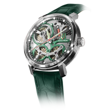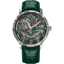The Dial features Smoke grey open-work dial with signature Accutron green accents and transparent outer ring. Light green super luminous markers, white hour and minute hands and orange second hand. Stainless steel case and bezel with stamped Accutron logo and turbine design on the case back. The Watch Band is a Matte green genuine American alligator strap – ethically sourced in the US under the guidance of the US Fish & Wildlife Regulations and all CITIES regulations for International Trade – with easy release spring bar and double-press deployant closure.