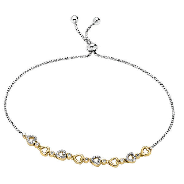 This yellow and white sterling silver bolo bracelet features 1/8 CTW of sparkling diamonds encrusted in two-tone metal hearts that link together along the top. Made with a sturdy box chain, this diamond bolo bracelet is adjustable on the bottom with a medallion bead, finished with two swinging fringes that add a luxe element. Perfect as a gift for anniversaries or birthdays, this diamond heart bracelet is easy to mix and match. Diamond clarity is SI3, color G-H.