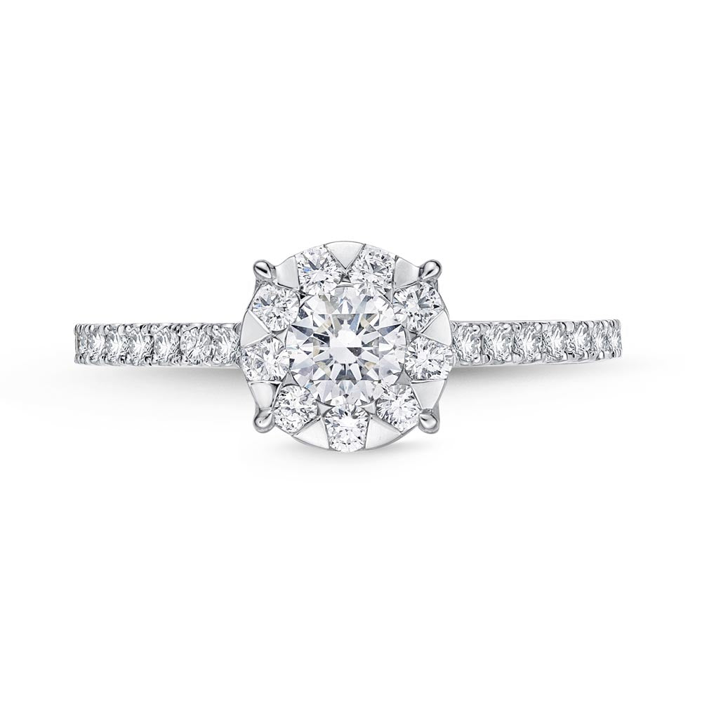 Diamond Bouquets 4-prong Diamond Engagement Ring that will stun. The diamond looks twice as big wrapped in a ring of diamonds and white gold.