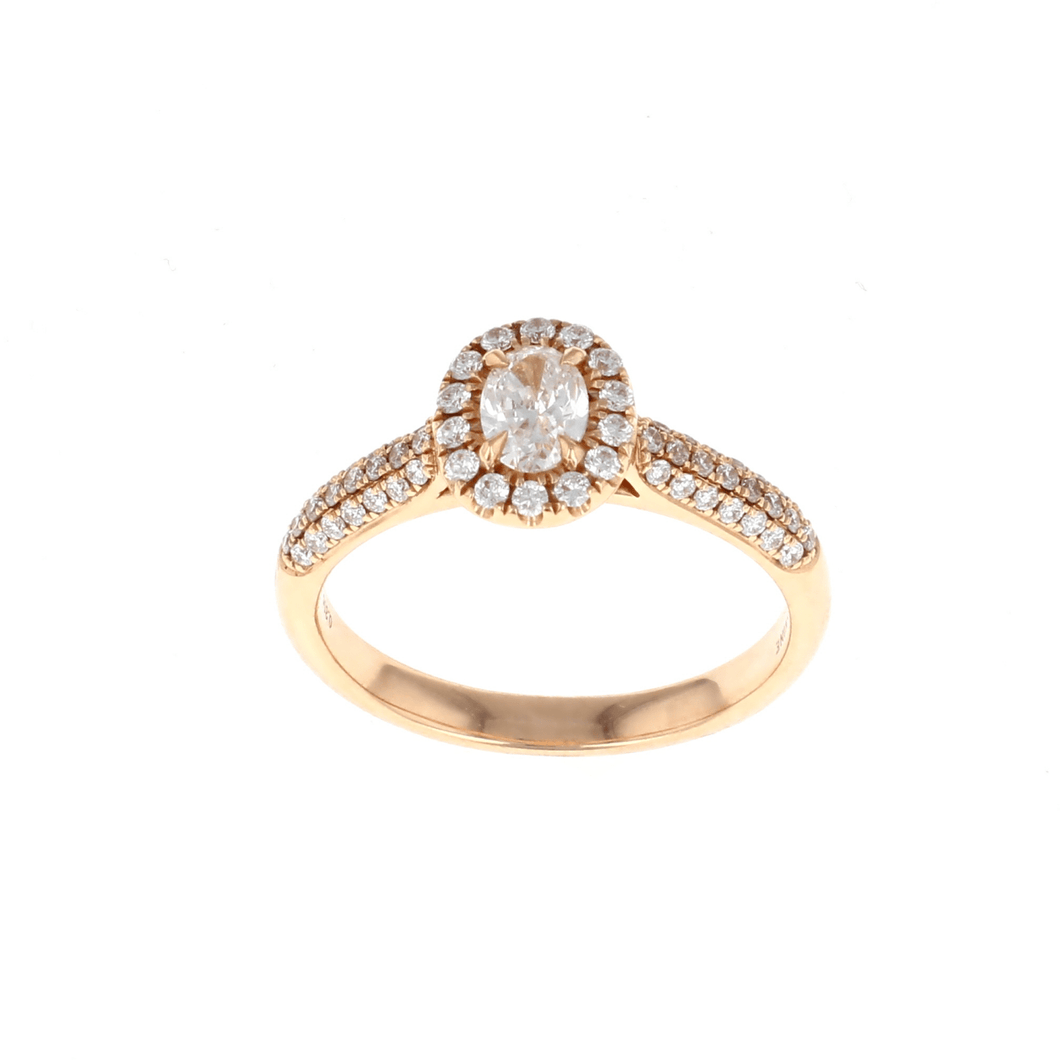 This beautiful Halo Complete engagement ring with a beautiful Oval Center stone and a 3 row 1/2 way semi mount set in 18K Rose Gold is a beautiful way to ask, "Will you marry me?"