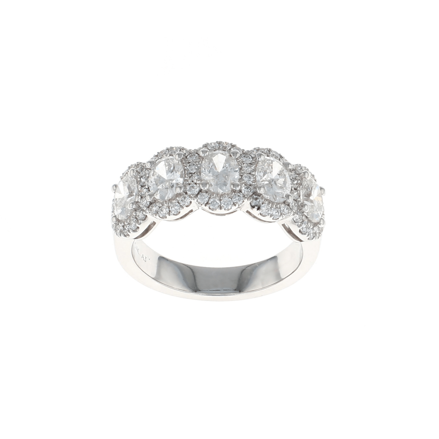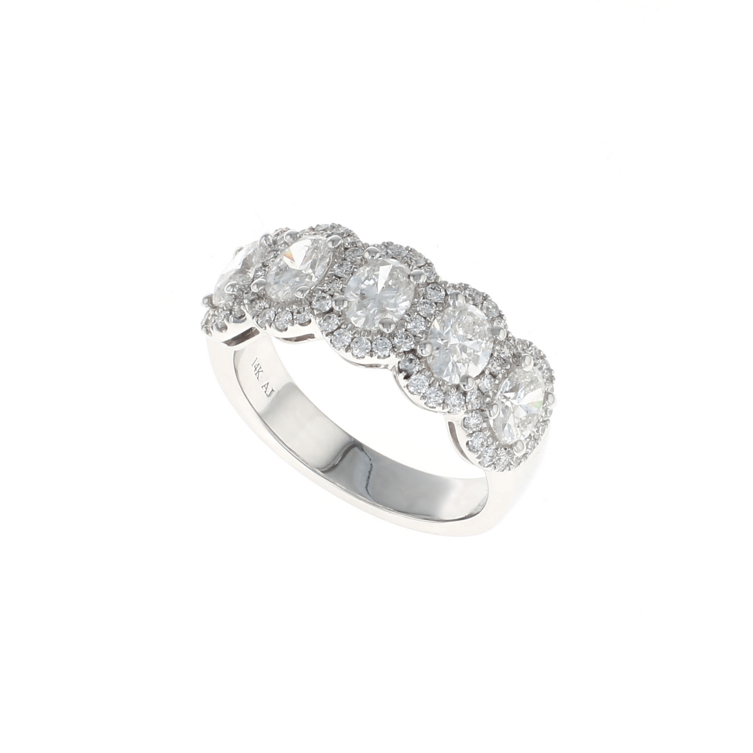 Celebrate your love with this beautiful 14K White Gold Five Stone Oval Diamond Halo Band Ring. For an anniversary, birthday or just because, she will love it!