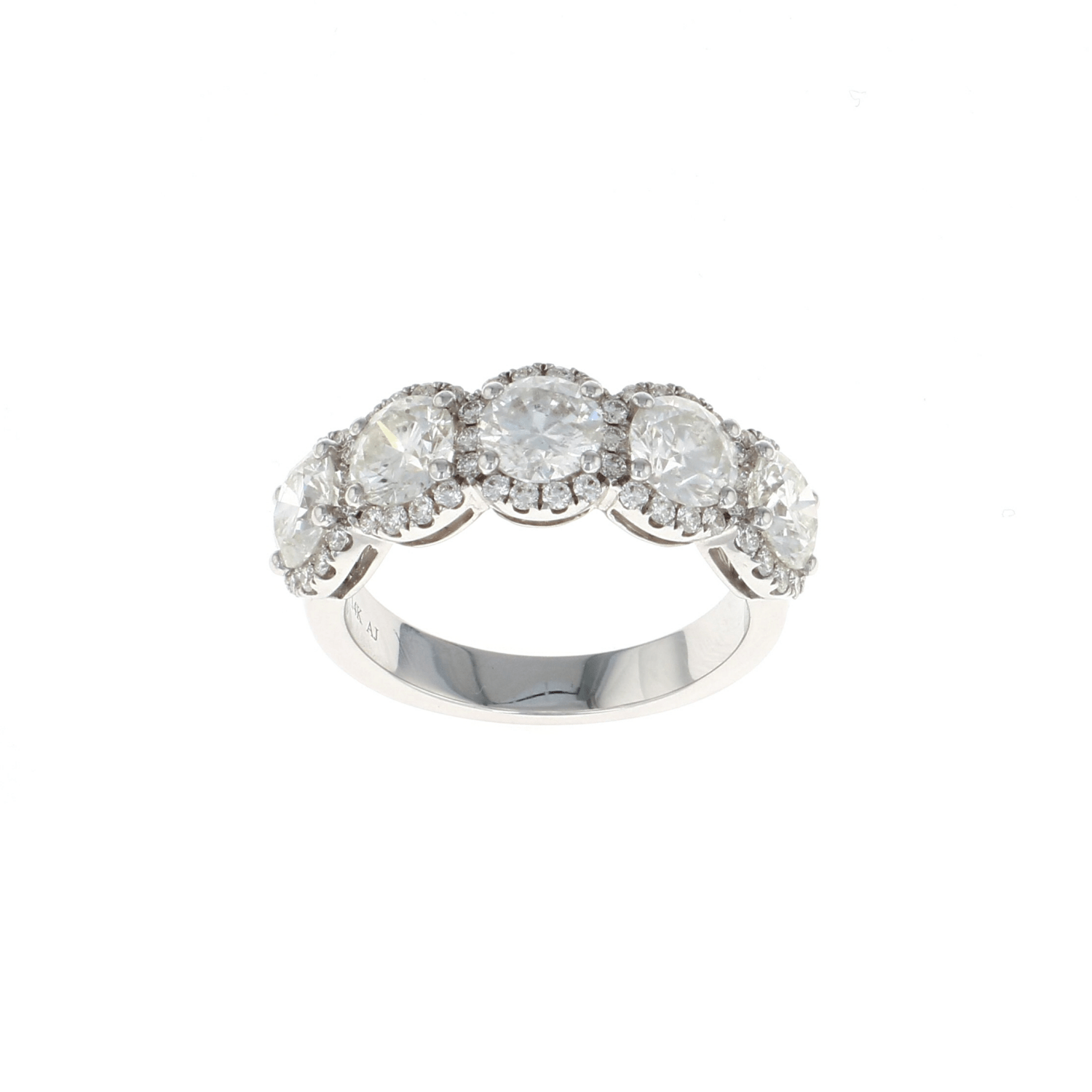 Celebrate your love with this beautiful 14K White Gold Five Stone Round Diamond Halo Pave Band Ring. For an anniversary, birthday or just because, she will love it!