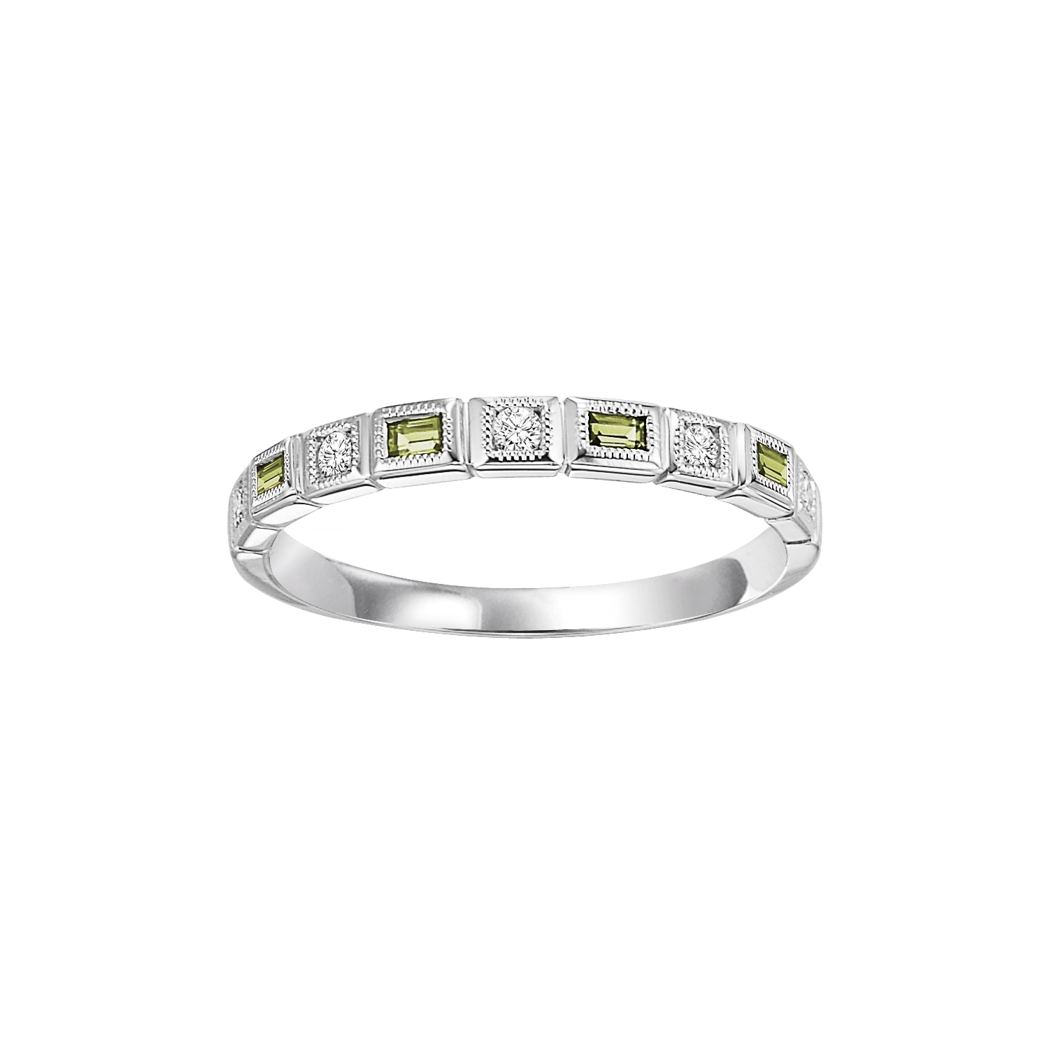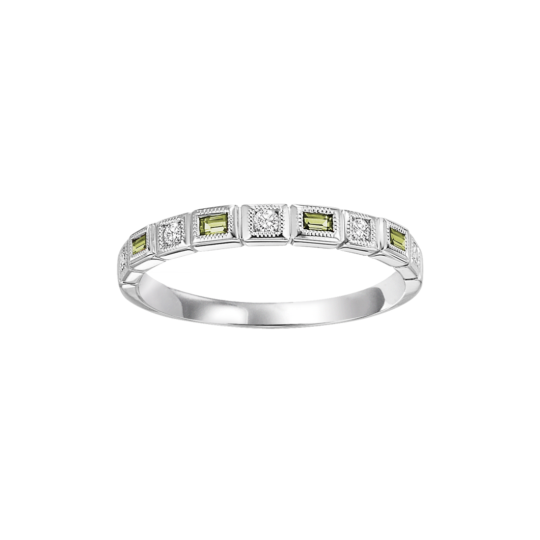 Make a fashion statement with this stackable eye-catching 10K White, Yellow or Rose Gold 0.10CTW Diamond & 0.16CTW Peridot ring. Wearing just one ring, or several, mix the metals or the gemstone colors, the combinations are endless!