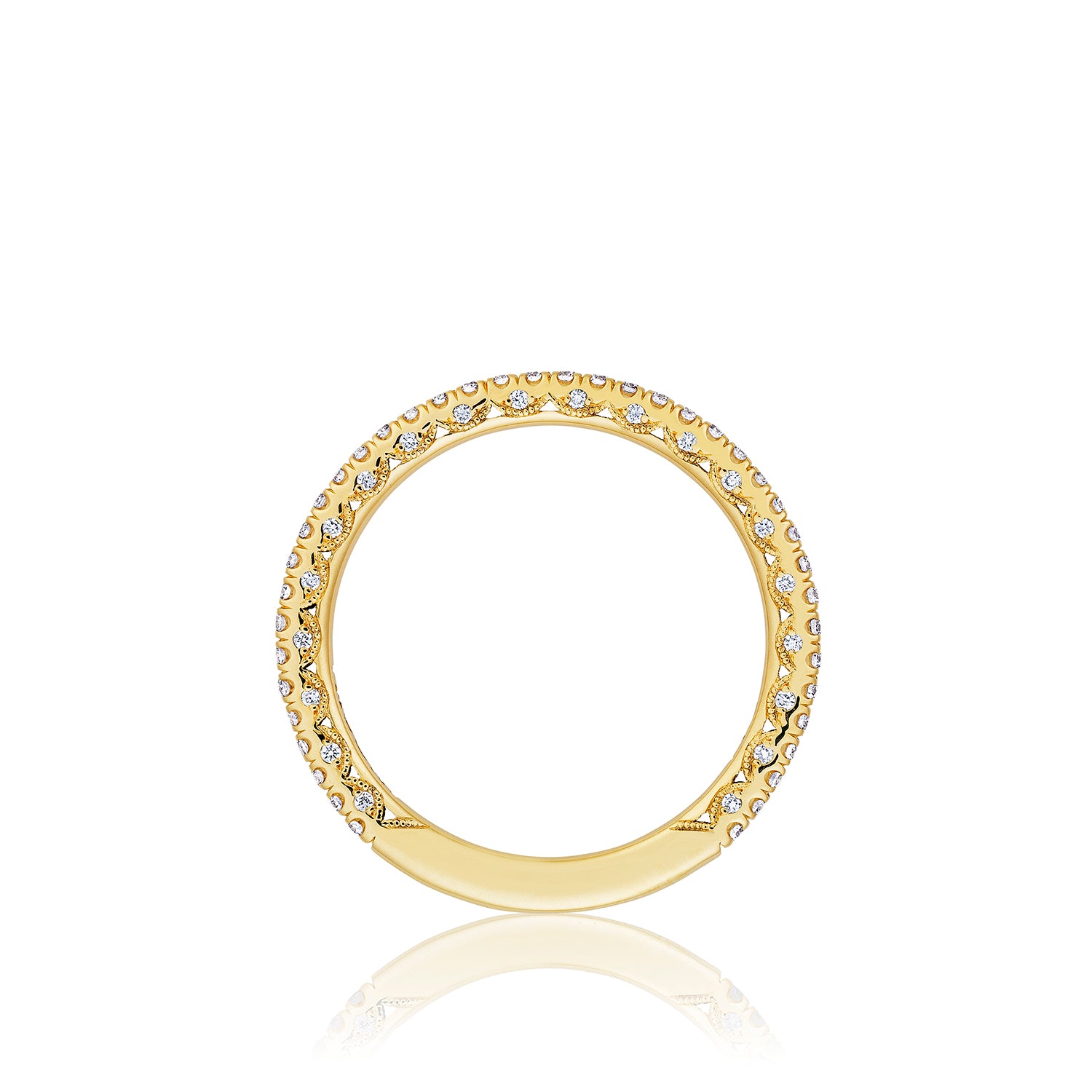 Bright white diamonds dance across the sunlight on this stunning yellow gold Tacori wedding band. For the Tacori Girl who loves to sparkle, diamonds sprinkled along this 3/4 way band will always remind her of the commitment she made that will last a lifetime. With a breathtaking interior, this Tacori wedding band features the classic crescent silhouette design allowing windows of light in from all angles.