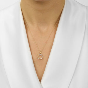 This contemporary 10k yellow gold double eternity circle pendant exudes a timeless appeal with its sleek lines and geometric shape. A total of 1/10 carat of sparkling round brilliant cut diamonds are set on one of the circles, creating a texture contrast. This pendant is set on a smooth tapered bail, finished with a sturdy chain threaded through. Eternity circles represent love and everlasting commitment, which makes this the perfect gift to give. Diamond clarity is I1-I2, color G-H.