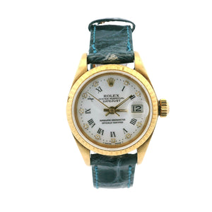 69138 Pre-owned Ladies President Rolex 18K yellow gold bezel and white dial with diamonds and a blue leather strap.
