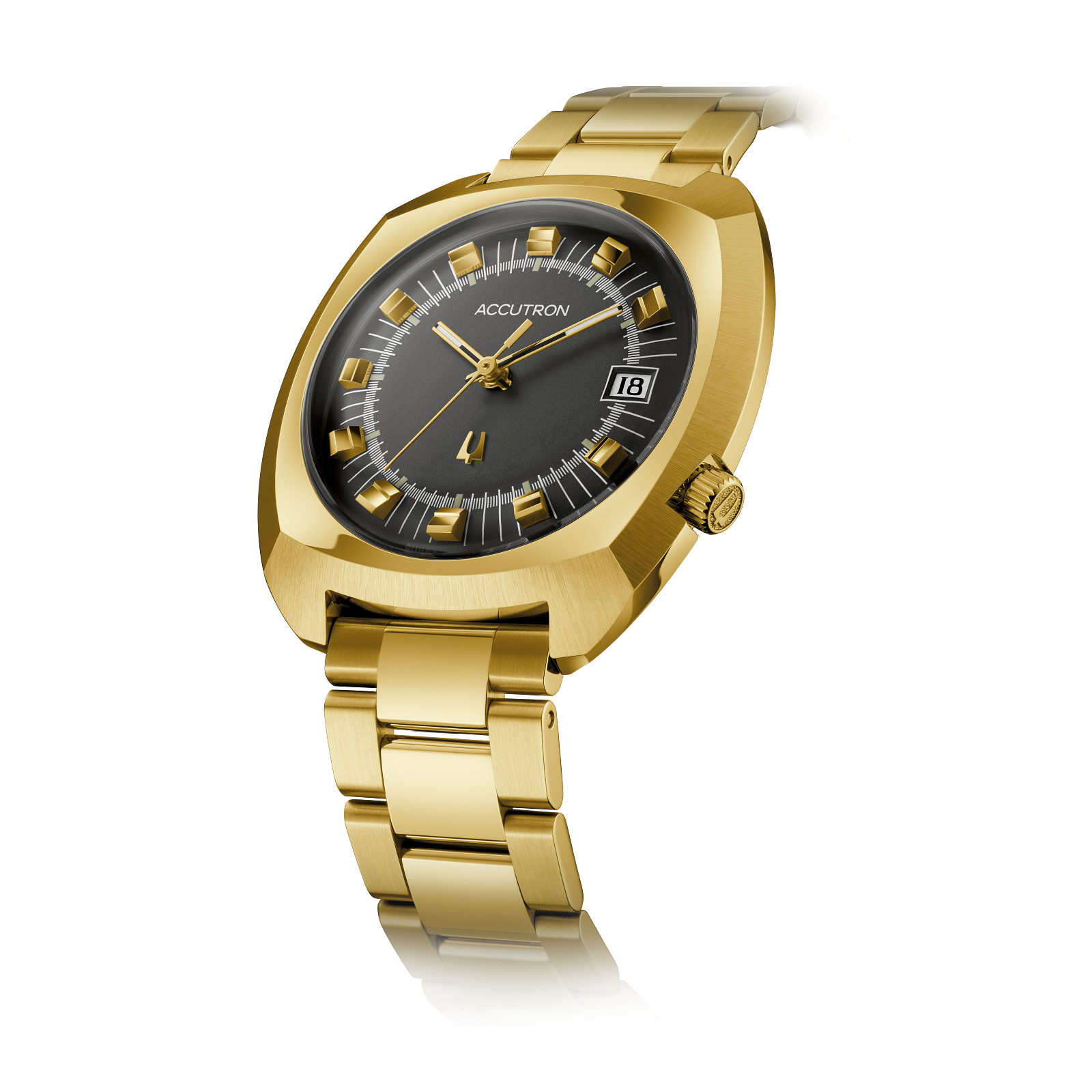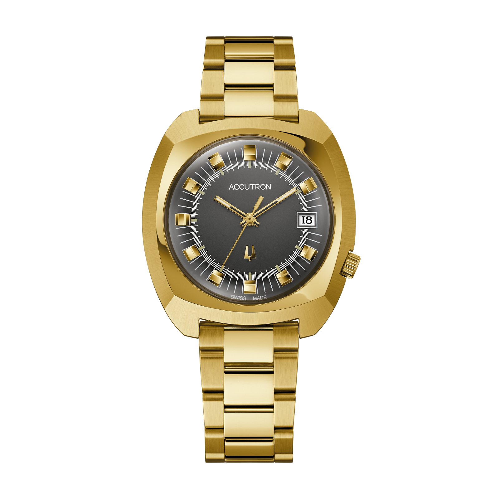 With a gold-tone stainless steel case and three-link bracelet with double-press closure, this Legacy collection timepiece from Accutron is a reimagining of the classic “261” from 1971. It features a unique cushion case design, a crown placement at 4 o’clock, a grey dial with sculptured and applied markers, and a calendar feature. Powered by Accutron’s Swiss-made 26-jewel movement, this classic luxury watch retains its original 38.5mm case diameter, giving it a timeless look that will look great on any wrist. Looking back while moving forward — this watch doesn’t believe we have to abandon the past to imagine a successful future.