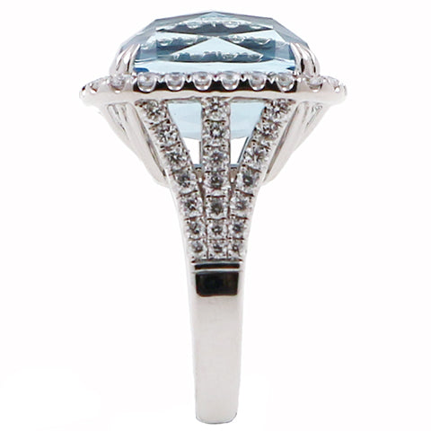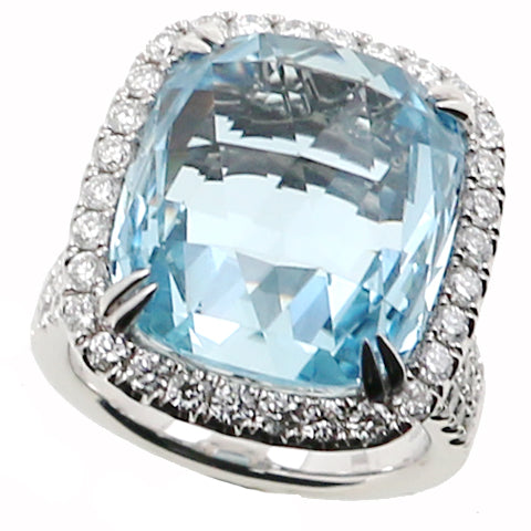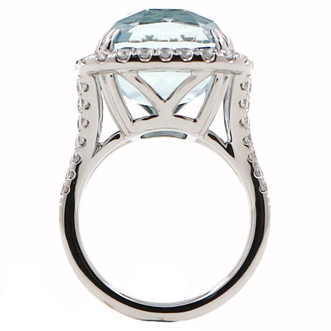 This aquamarine and diamond ring has a 15.70 cushion cut aquamarine and a total carat weight of 1.36cts in a halo semi mounting made of 14k white gold.