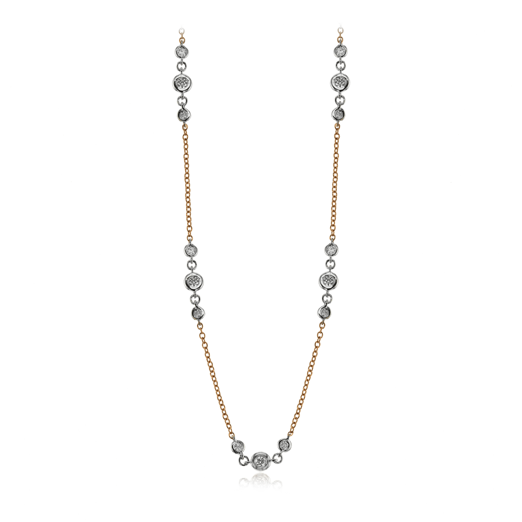 Contemporary and stylish, this necklace design contains 1.02 ctw of white diamonds in various sizes set with 18k white and rose gold.