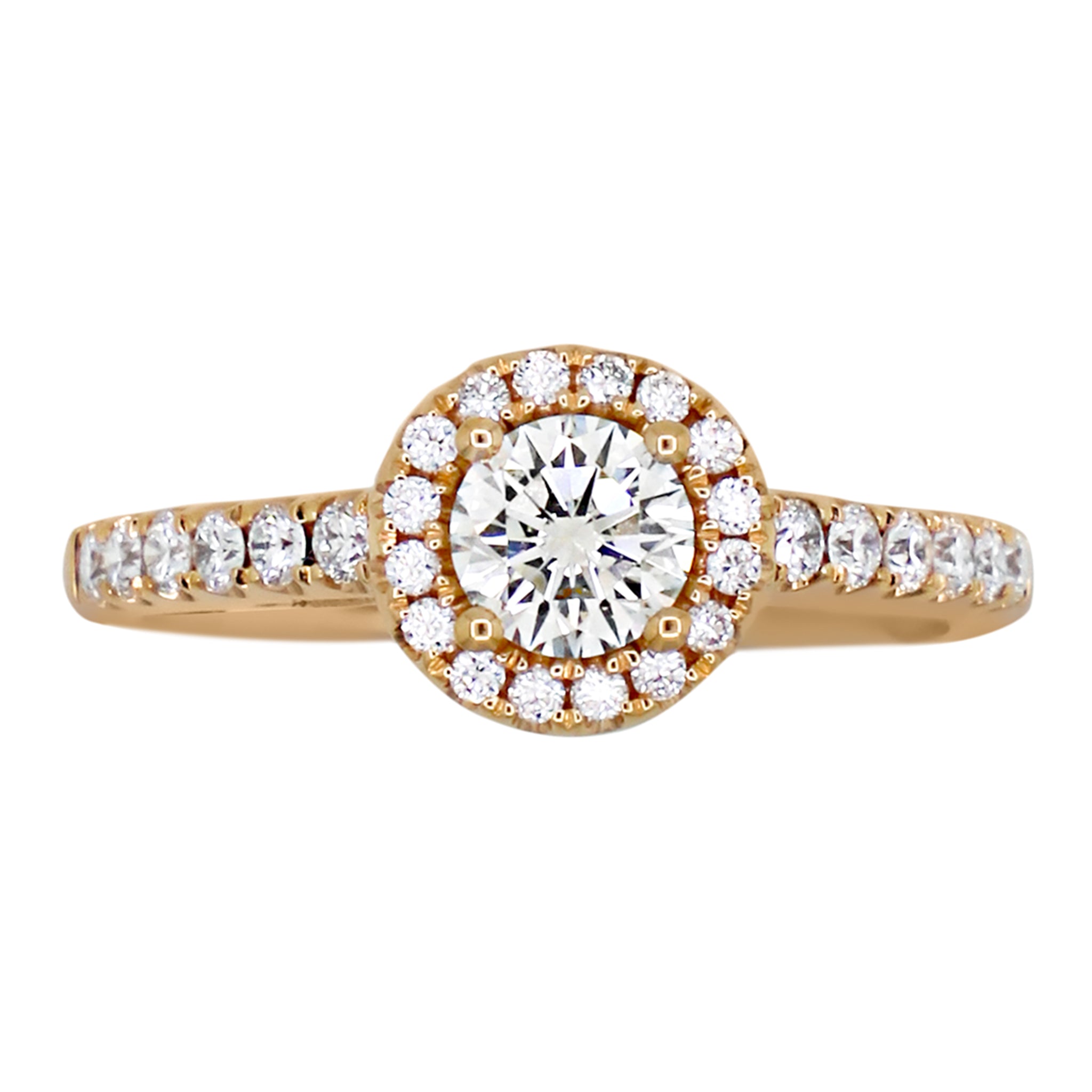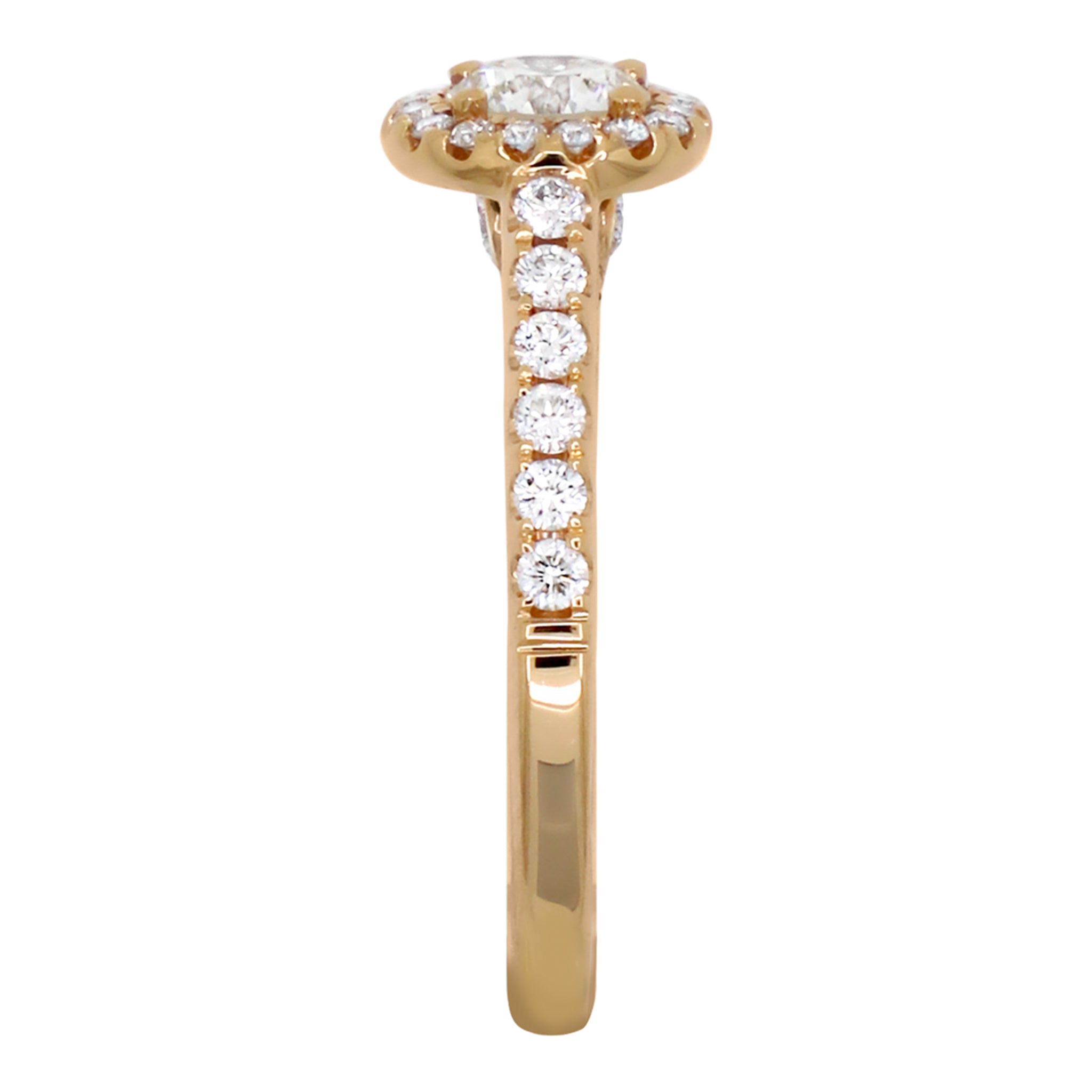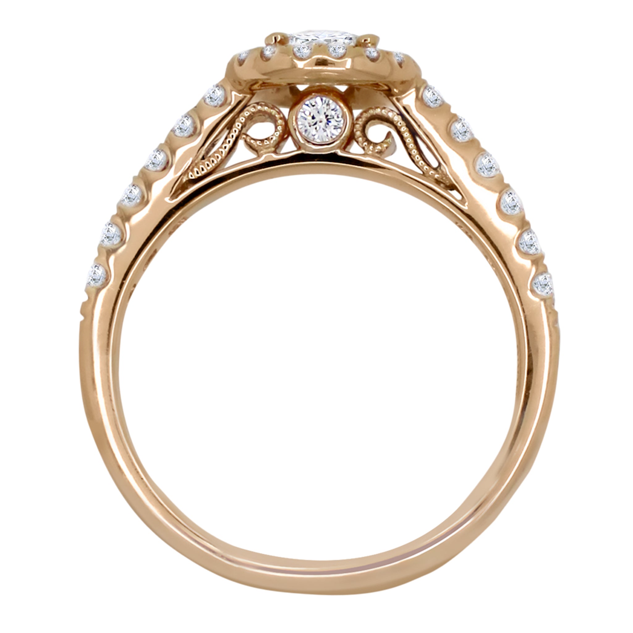 This engagement ring has a .45-ct. round center diamond with L color and SI1 clarity. The setting is 18k rose gold and has a .38 ctw.