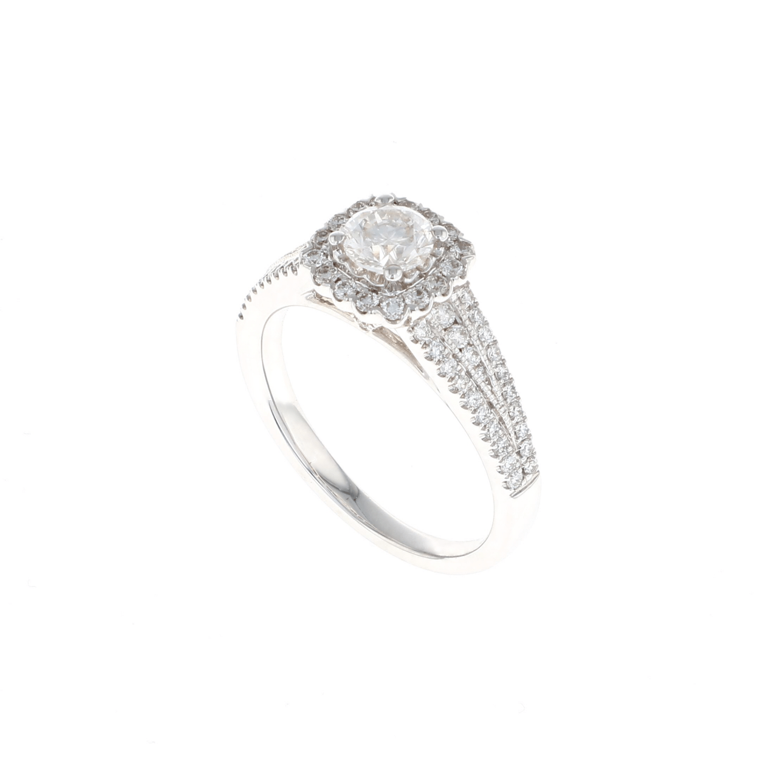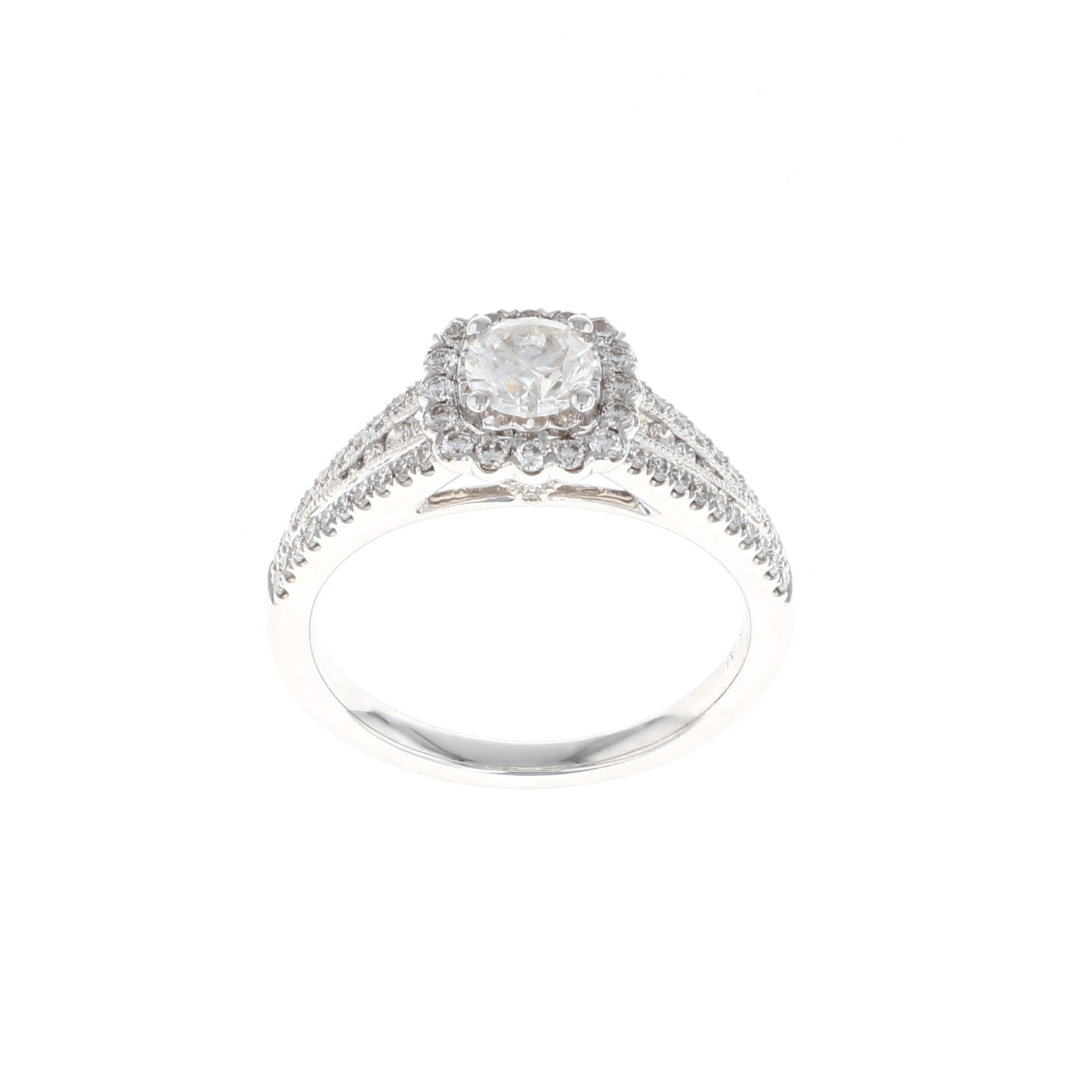 This complete engagement ring features a round center diamond with a cushion shaped halo highlighted with a 1/2 split shank semi mount set in 14K white gold. A beautiful way to say, "Will you marry me?"