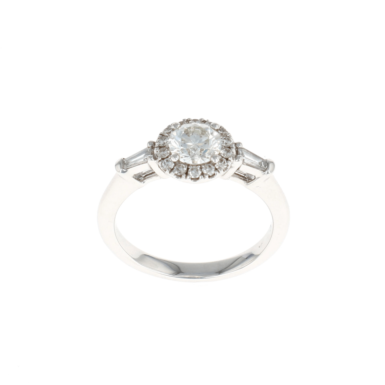 This engagement ring features a round shaped center diamond with a halo and baguette on either side set in 14K white gold.
