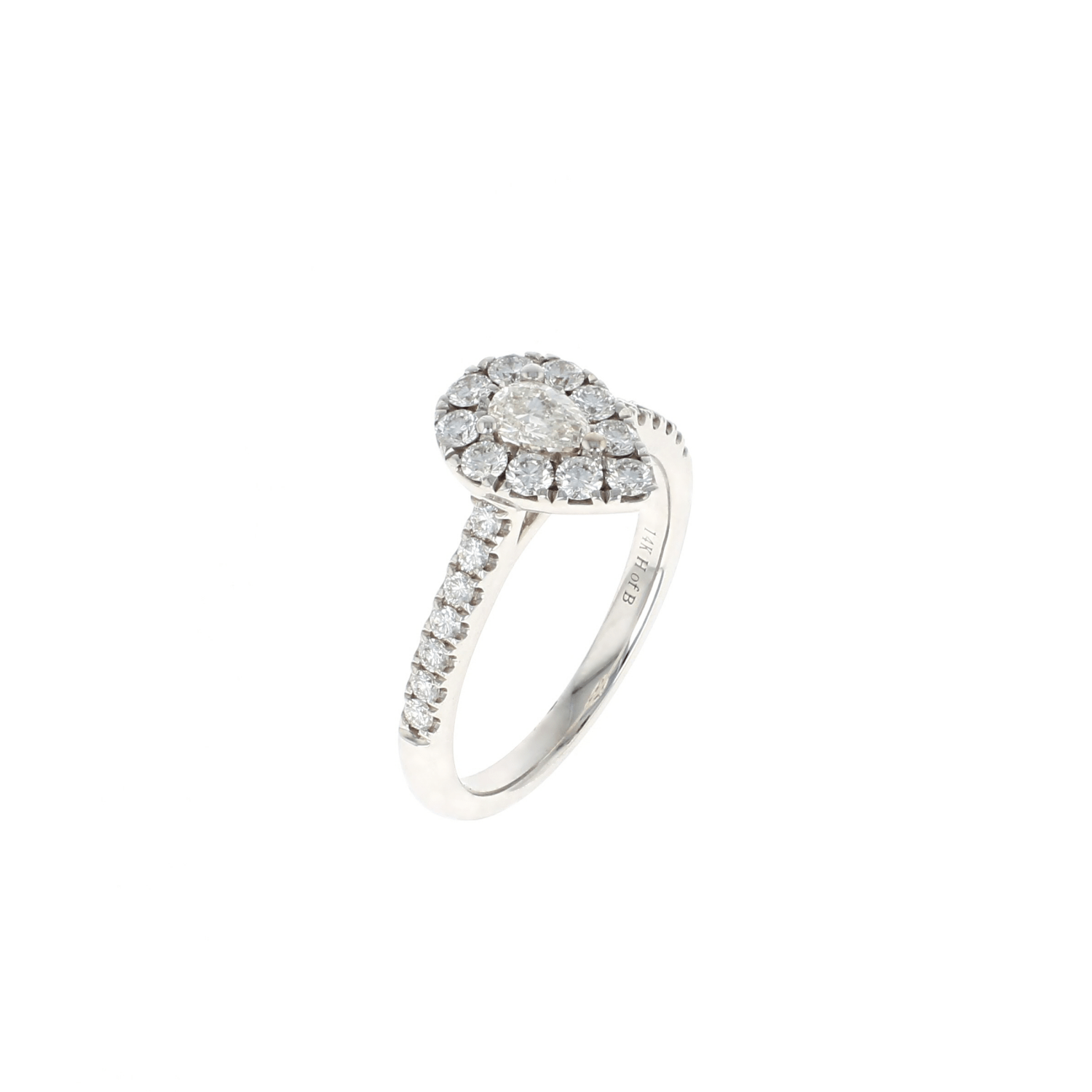 This engagement ring features a pear shaped center diamond with a halo and 1/2 way pave semi mount set in 14K white gold.