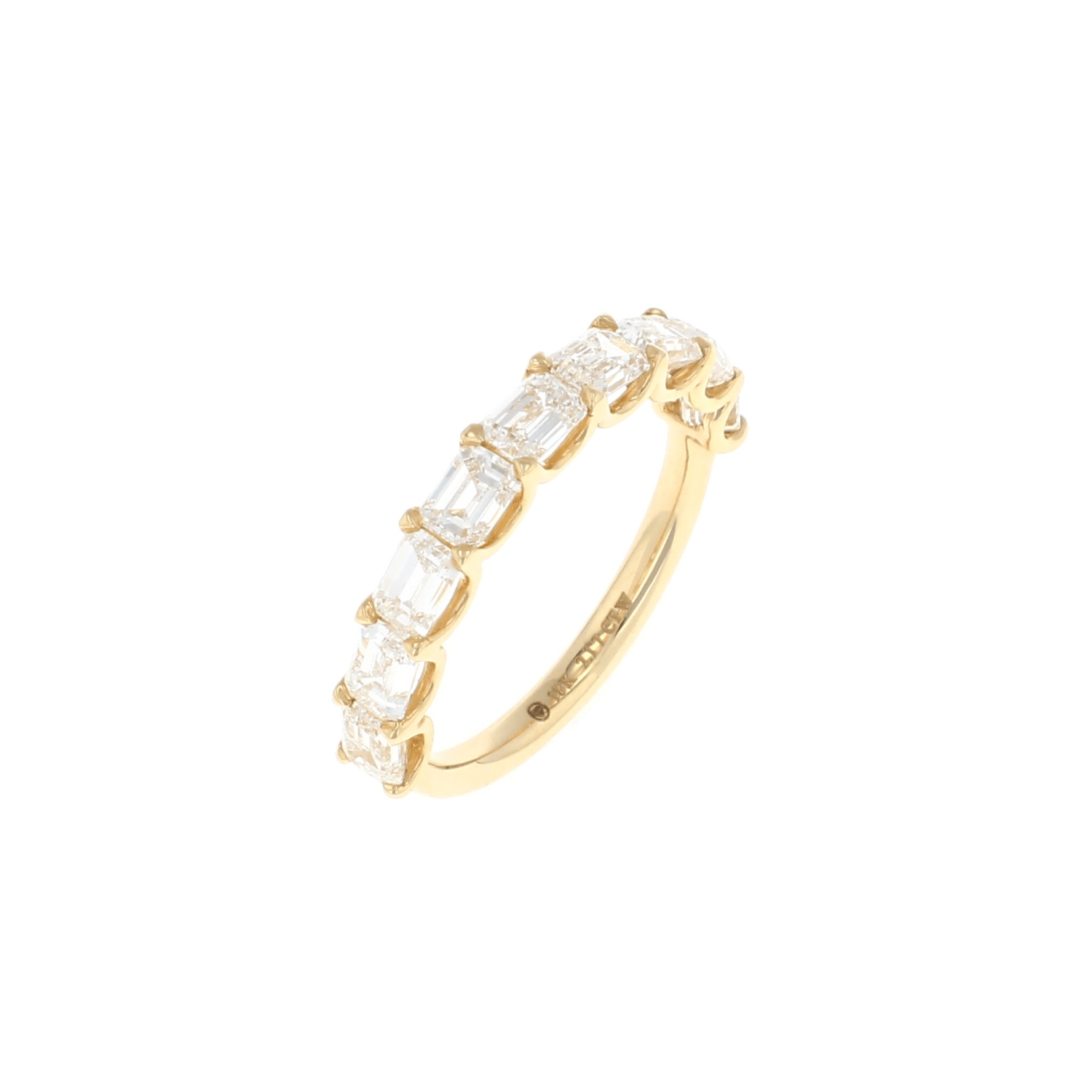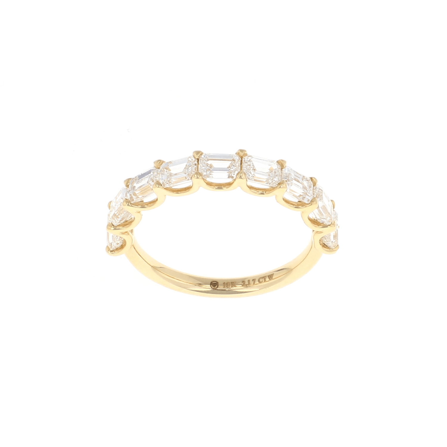 This 18k Yellow Gold Emerald Cut Diamond band with 2.17CTW of nine brilliant cut diamonds has that fantastic sparkle that you are looking for. It is perfect for pairing along with engagement rings, other bands, stacking or worn solo. This classic diamond band is a great gift to give to that special someone in mind.