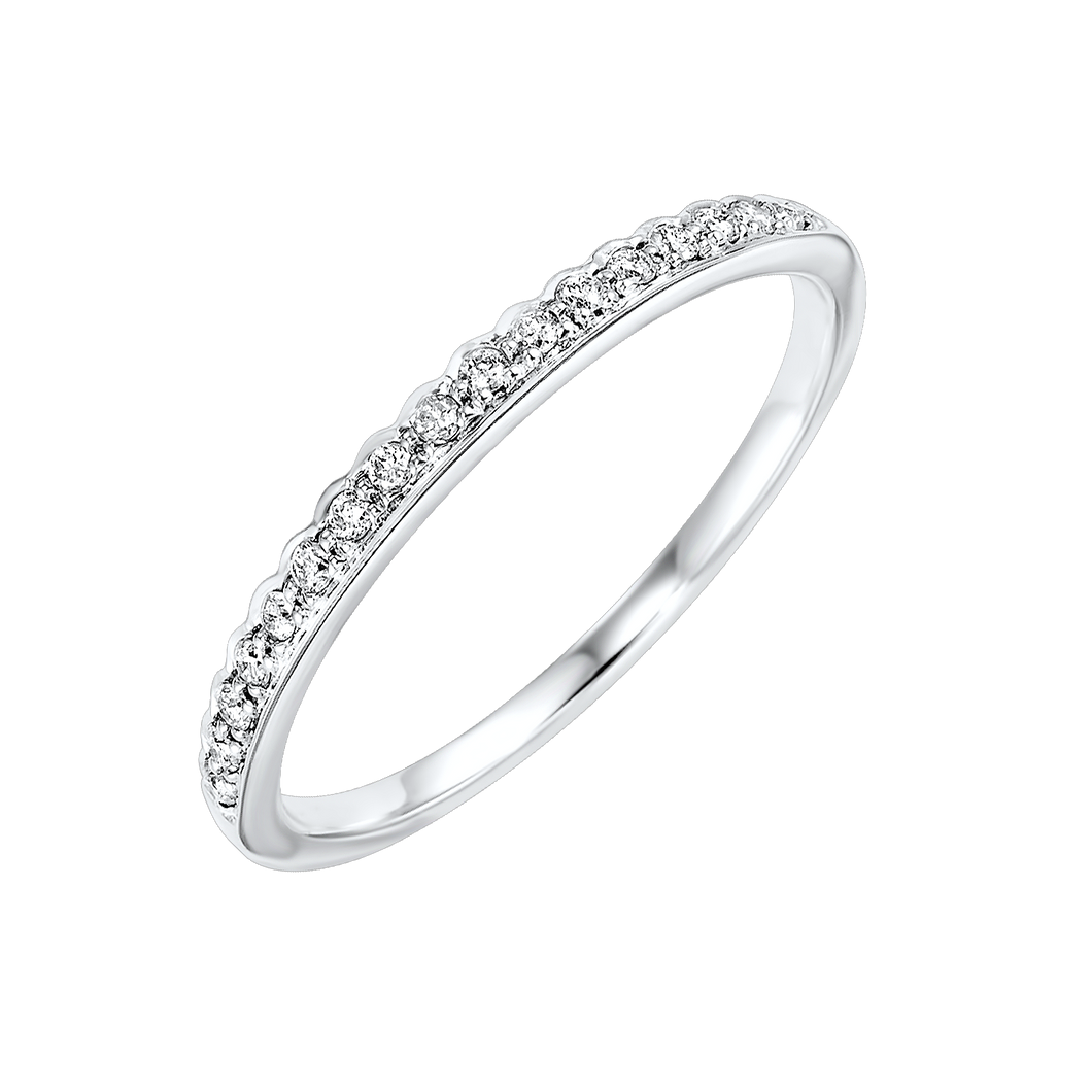 A scintillating row of round brilliant cut diamonds are set on the top of this diamond band, sparkling in a quarter eternity setting that can effortlessly be paired with your engagement ring. Created in brightly polished 10k white gold, this ultra-slim band is perfect for stacking with other rings or worn alone with its understated statement in style. Diamond clarity is I1-I2, color G-H.