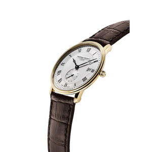 This Frederique Constant Mens Ultra Slim with a second date feature on dial is the epitome of class. Featuring a White face, Gold Plated case, and Roman Numerals, this watch is simple and sleek. A Brown leather strap finishes off this casual look.