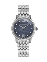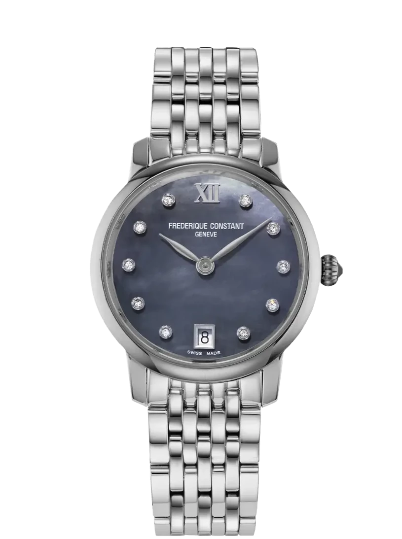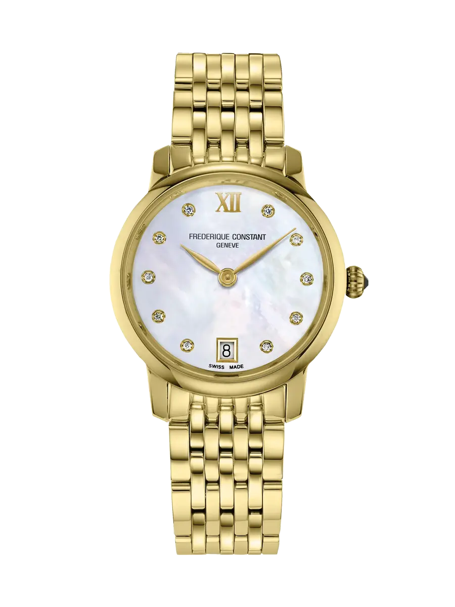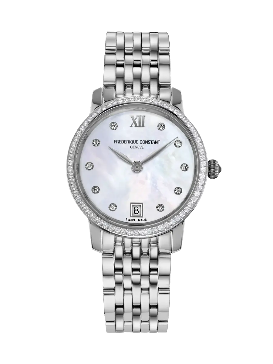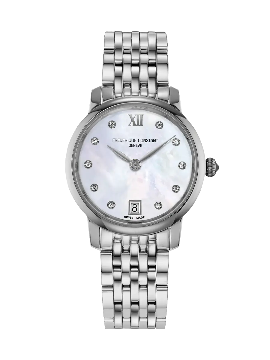 With a delicate 30 mm diameter, the Slimline Ladies captures the essence of Frédérique Constant. With a subtle interplay of diamonds, guilloche or mother-of-pearl, the Slimline Ladies stands out with grace and elegance.
