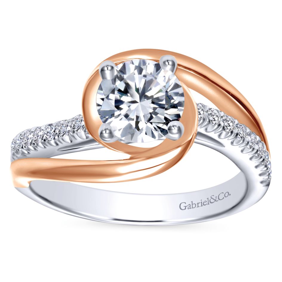 A contemporary twist on a classic engagement ring. Strands of white and pink gold spiral effortlessly around your sparkling round center stone . This Gabriel & Co. ring is surely a match made in heaven.