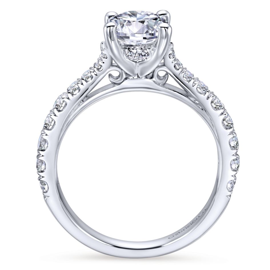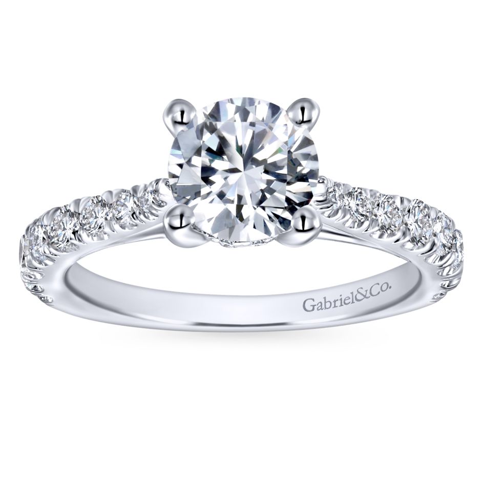 This white gold Gabriel & Co. engagement ring is anchored by a lightly tapered diamond band to perfectly accentuate your magnificent center stone.
