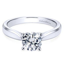 Simply sophisticated, this round cut solitaire engagement ring features a polished white gold band with beveled edges that's hand-crafted by Gabriel & Co.