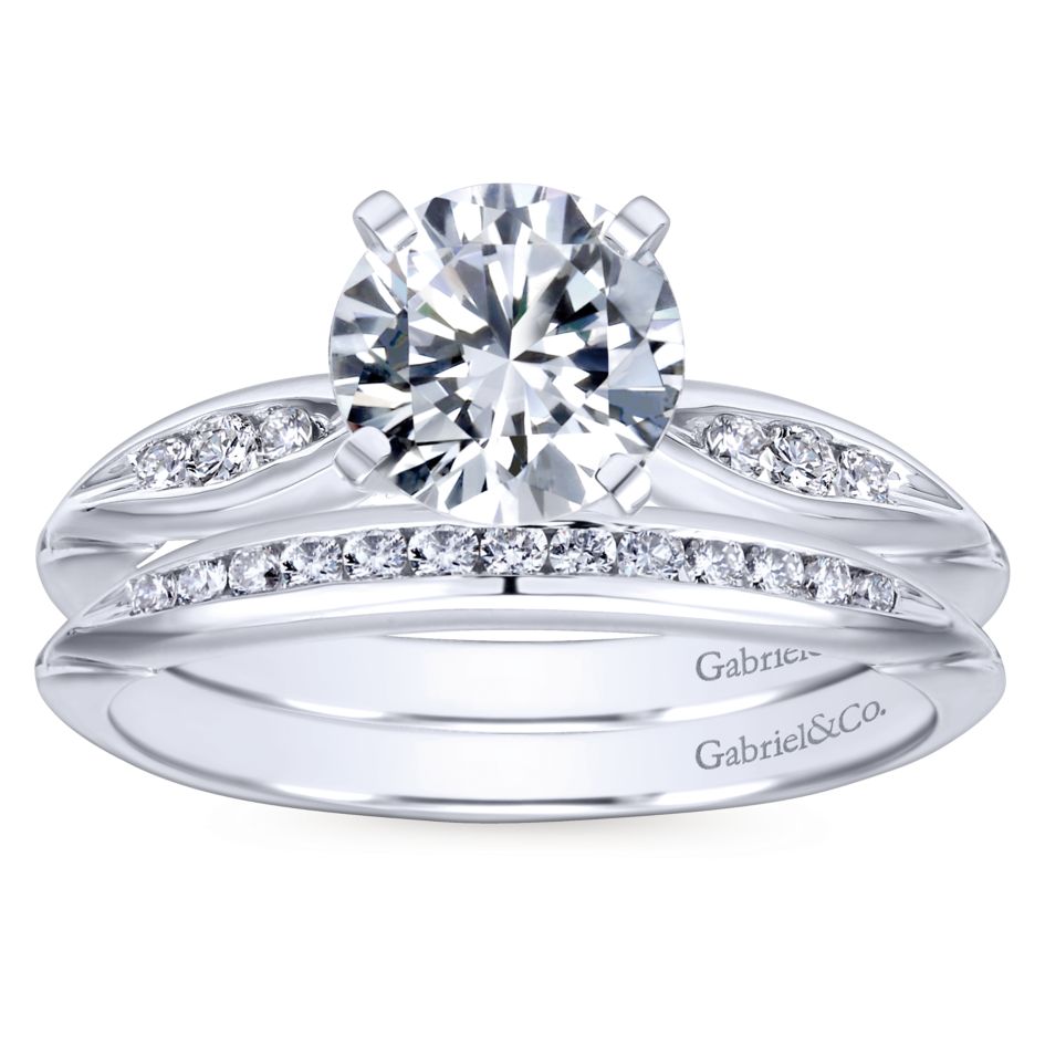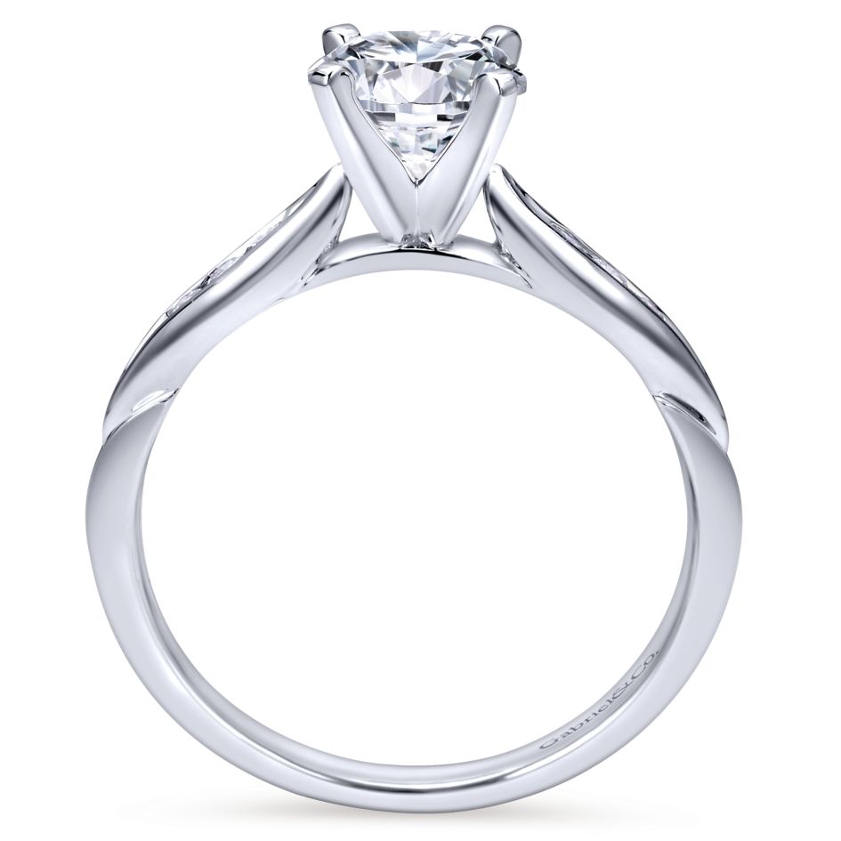 Gabriel & Co.'s sleek and sophisticated ring is straight styled for the classic woman. Showcasing your center stone with delicate oval channels on each side.