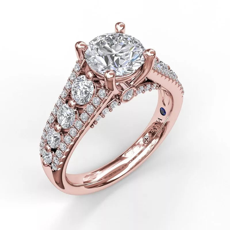 With an assortment of diamond sizes, this style emits triple the charm with three rows of diamonds that adorn the band, magnifying the center stone.