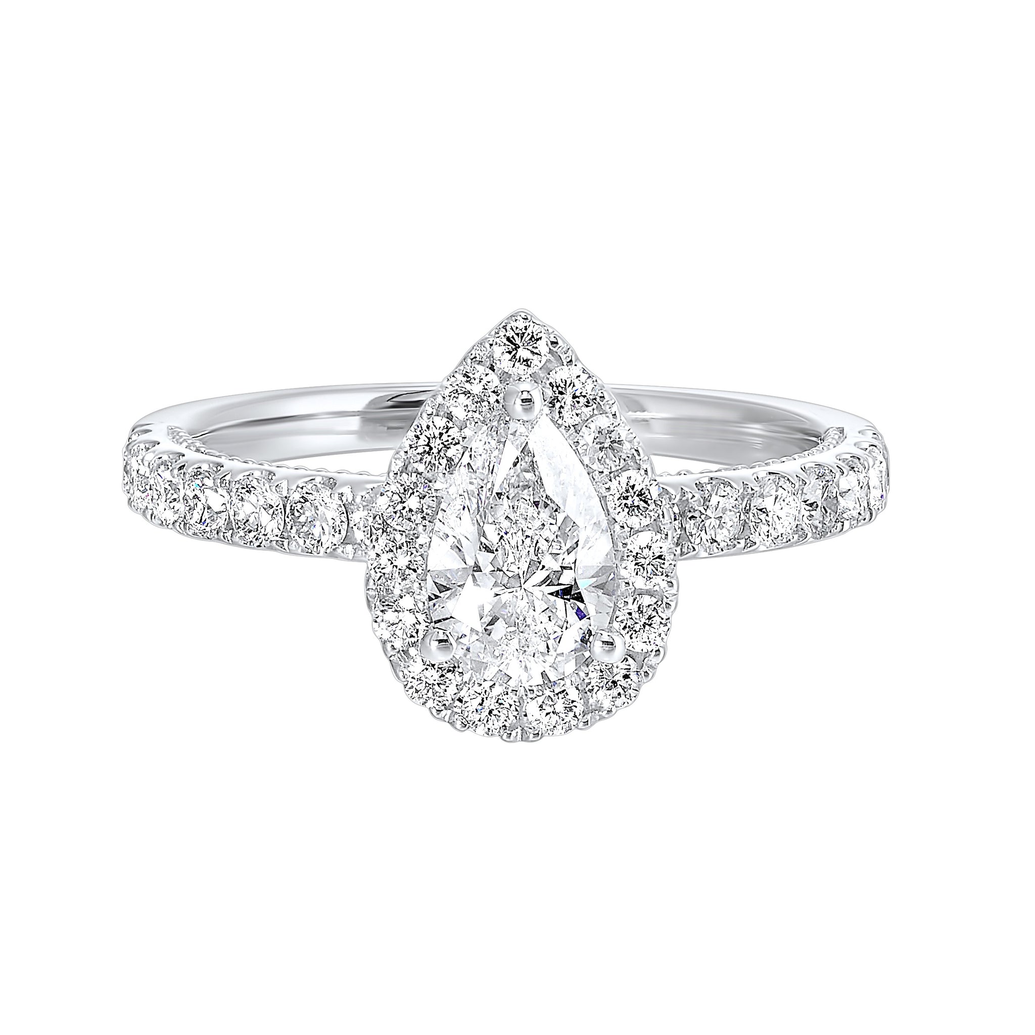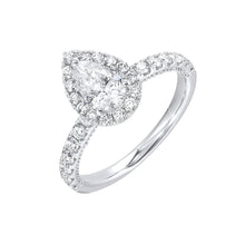 This engagement ring features a 0.70 pear shaped center diamond with a halo in 14k white gold