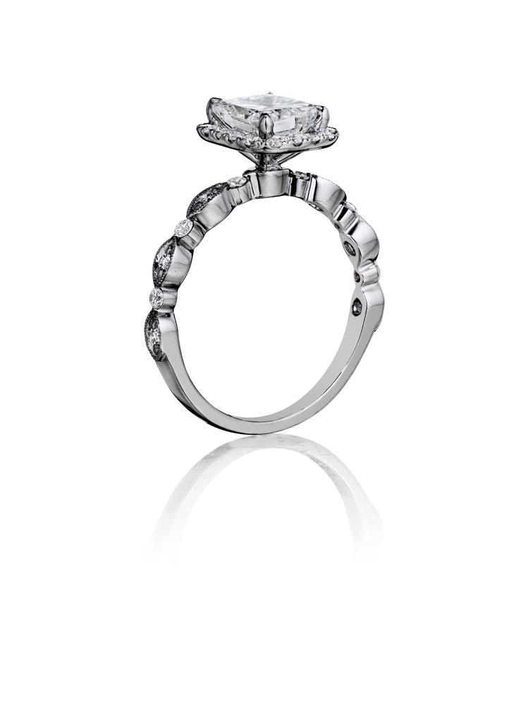 This antique inspired ring features a halo surrounding your choice of center diamond with pavé set diamonds in an intricate marquise pattern down the band.