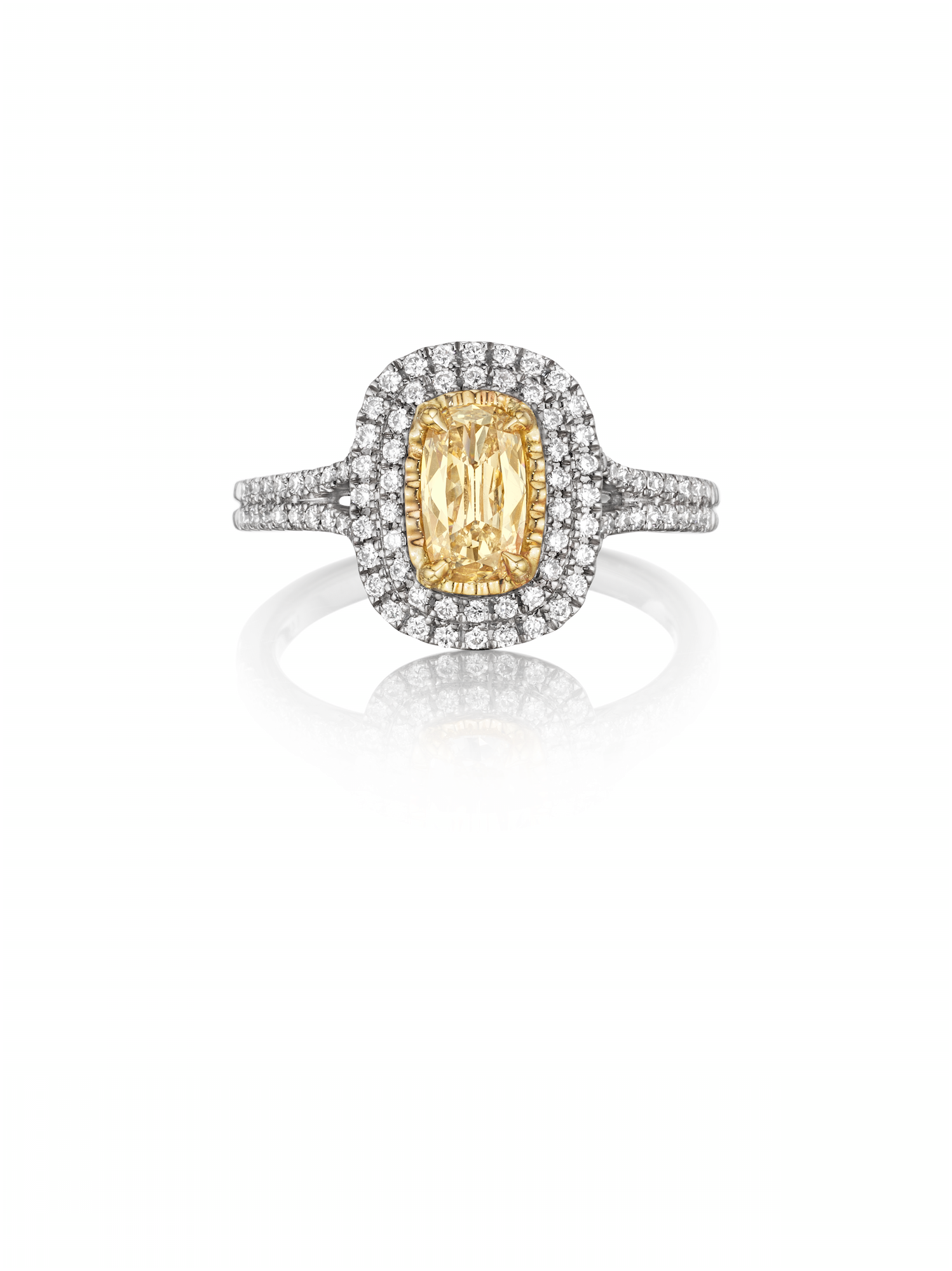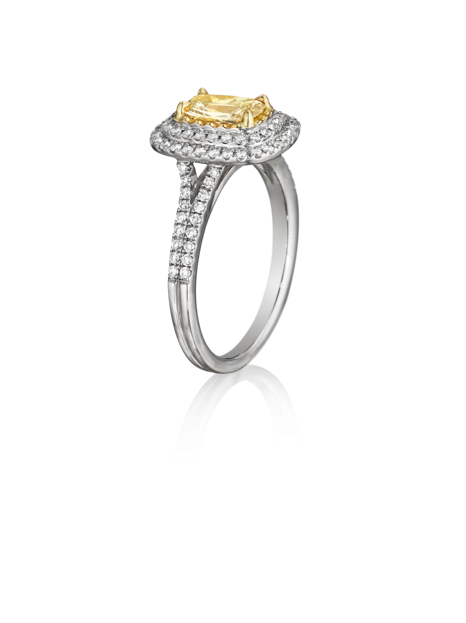 A yellow cushion cut diamond center radiates with a double diamond halo. Set on a split shank band, a strand of pavé diamonds finishes off this interestingly graceful look.