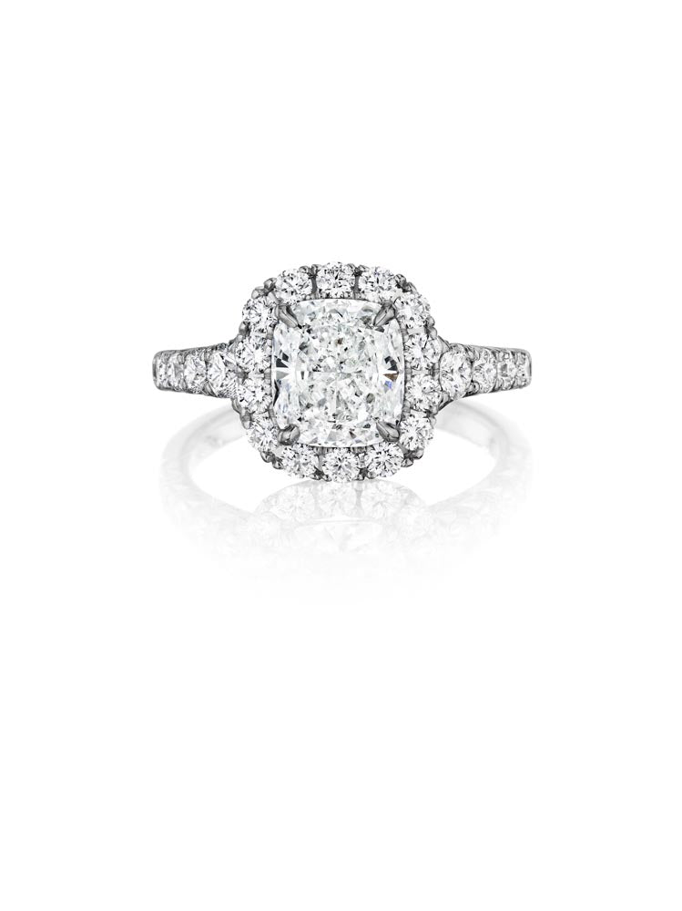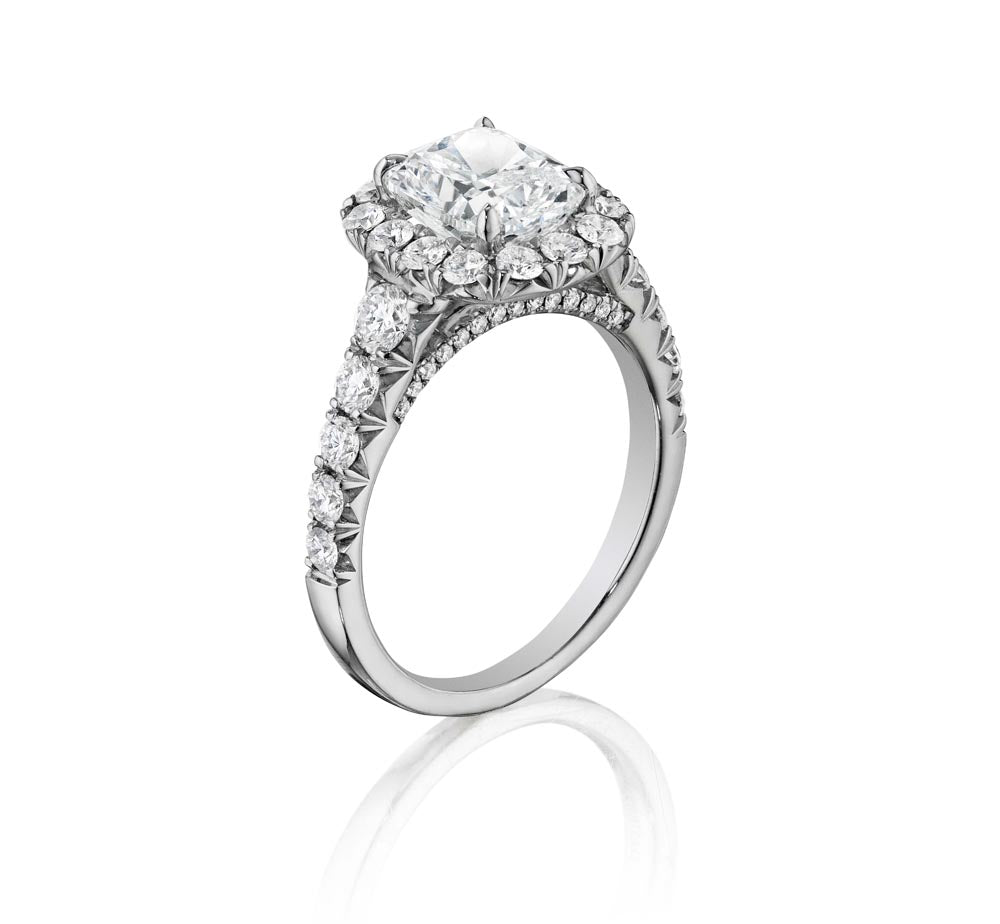 This timeless yet unconventional style has a graduated diamond shank and showcases a Signature Daussi Cushion™ cut diamond of your choice surrounded by a cushion halo.