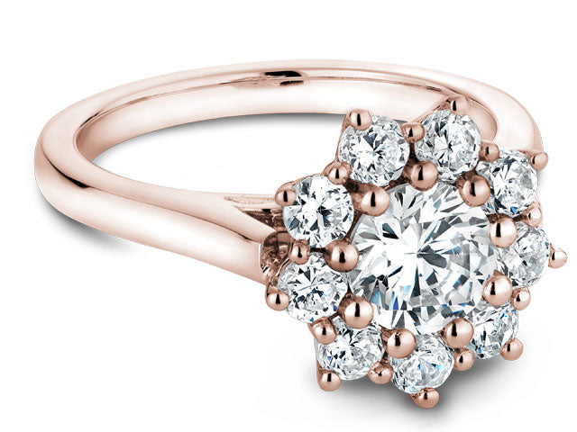 A Noam Carver rose gold floral engagement ring with 9 round diamonds.
