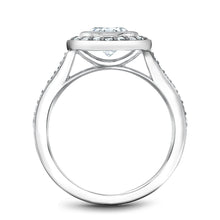 A Noam Carver white gold engagement ring with a round halo and 32 diamonds.