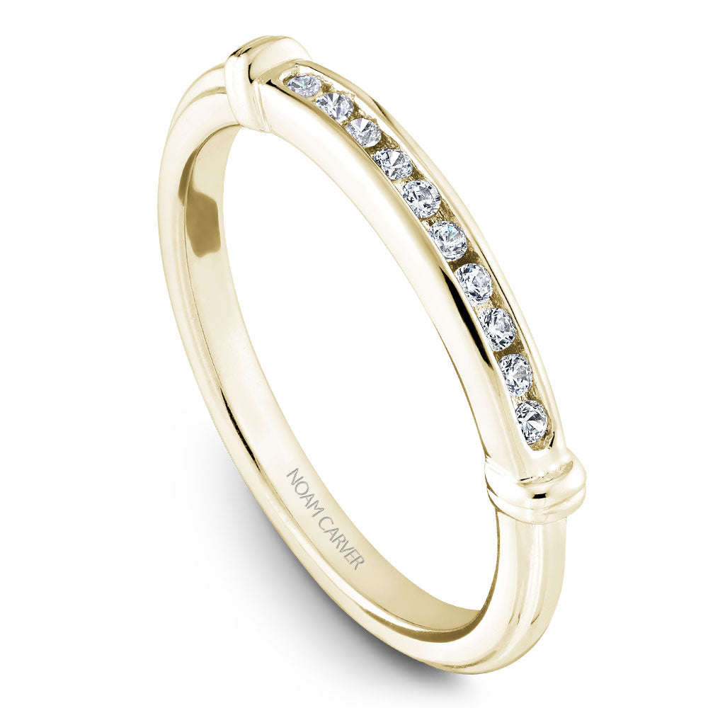 A Noam Carver yellow gold engagement ring with 18 round diamonds on a floral halo and a detailed band.
