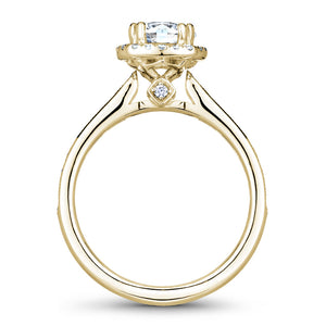 A Noam Carver yellow gold engagement ring with a round halo, 42 diamonds and milgrain detailing on a band.