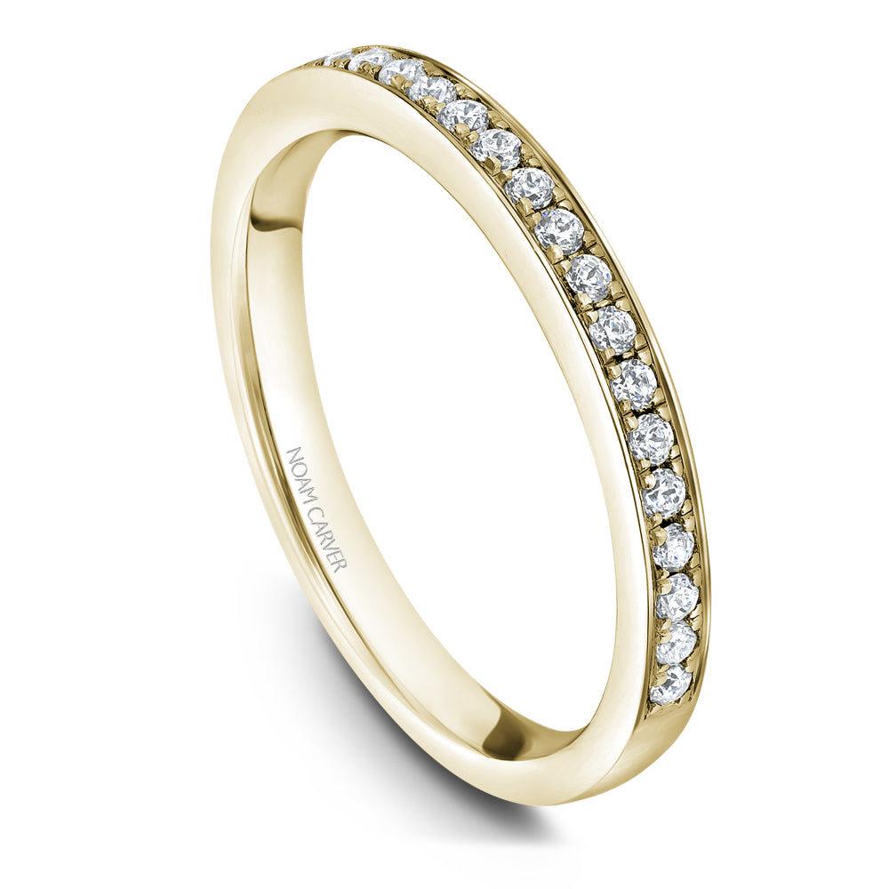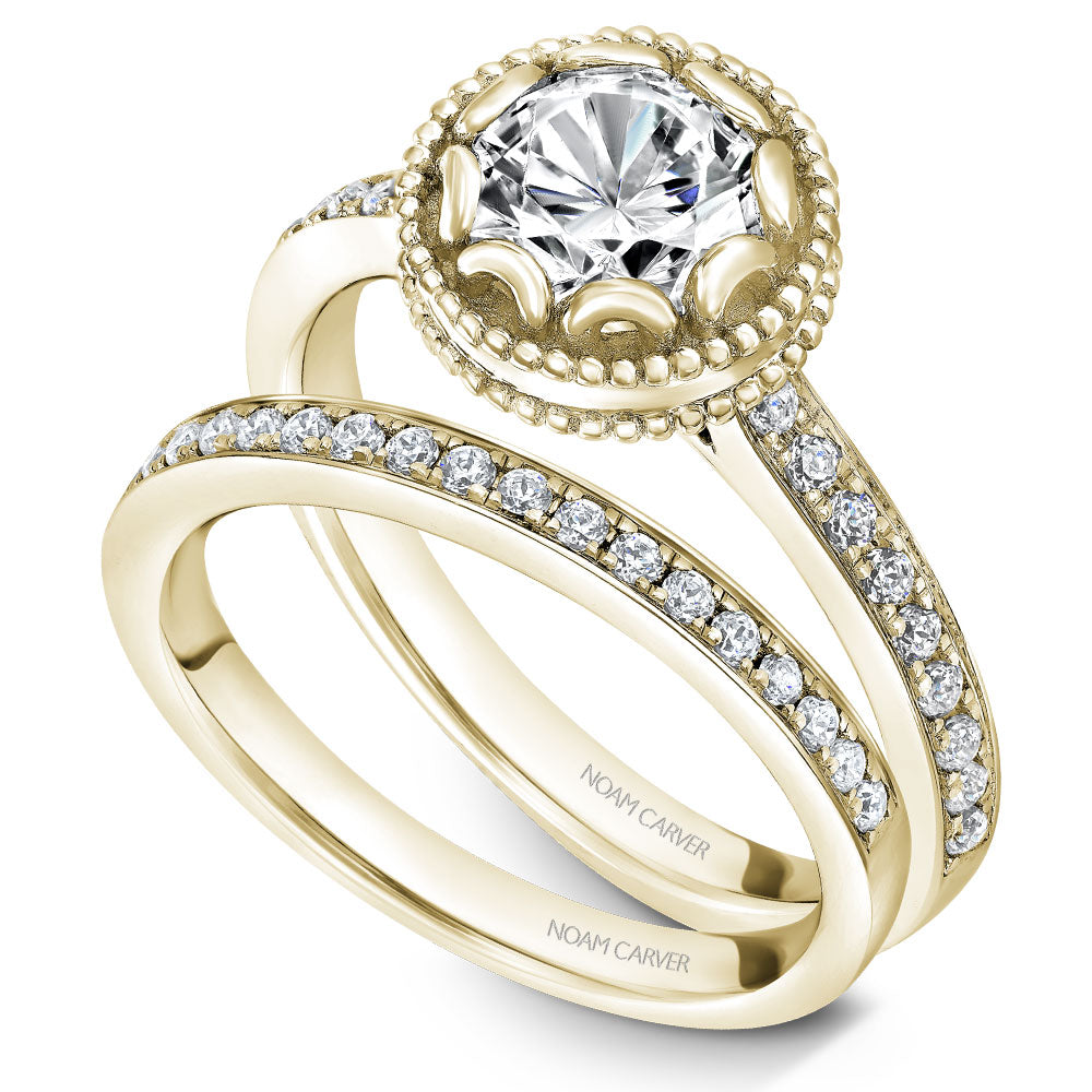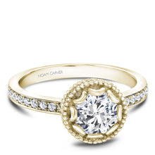 A Noam Carver yellow gold engagement ring with a floral setting and 18 round diamonds.