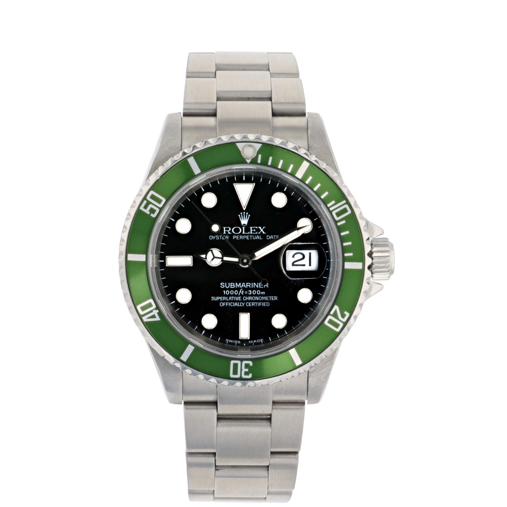 Pre Owned Rolex 16610LV Submariner "Kermit" 40mm. First Year F Serial Number. Black Dial, Date Window, Unidirectional Rotating Bezel, Green "Kermit" Insert