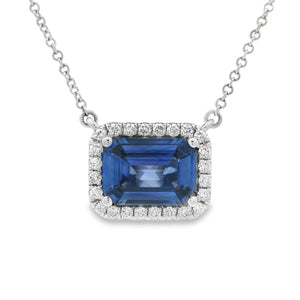 Add a touch of elegance to your look with our Sapphire & Diamond Pendant. Made from 18K White Gold, the Emerald Cut Sapphire is surrounded by a sparkling .24 CTW Diamond Halo, giving you a radiant and sophisticated appearance.