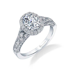 This Sylvie Designed Cheri Oval Vintage Inspired Engagement Ring features a fitting for 1.50CTW oval diamond set inside a lovely pave diamond halo and placed atop an antique inspired, tapered shank with milgrain and varied sizes of diamond accents. The rhythm of accents continue on the profile sides of the shank with more channel set diamonds. The total weight of this intricate vintage inspired engagement ring is 0.73CTW.