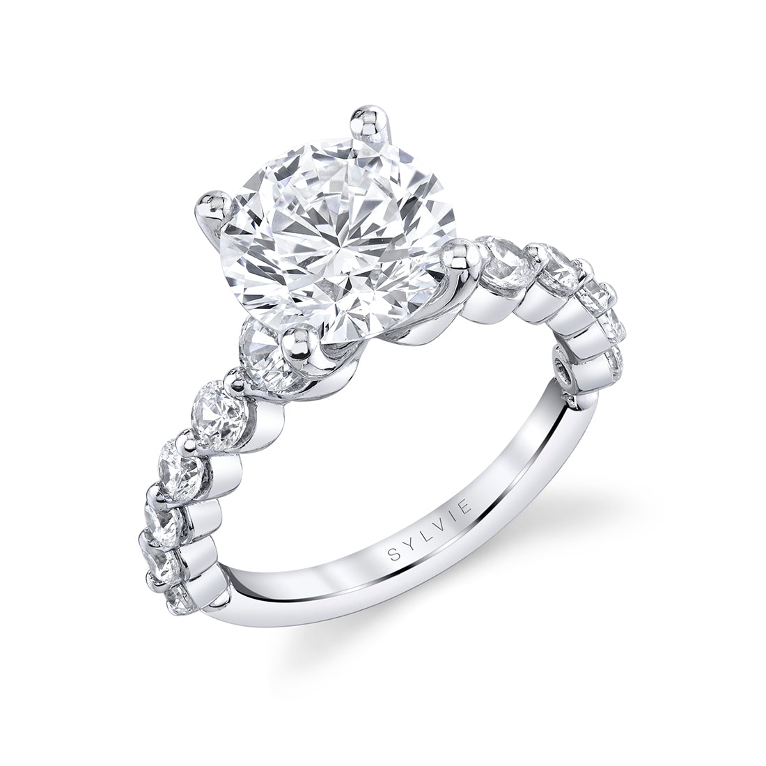 A Sylvie Designed Round Classic Single Prong Engagement Ring. This gorgeous and on trend engagement ring has a stunning semi mount for a 3 carat round center stone. The beautiful diamonds cascade down each side of the shank in a single prong form adding a delicate touch to a wide band. To make it even more unique, add your favorite gemstones or change the metal to colors such as rose gold or yellow gold.