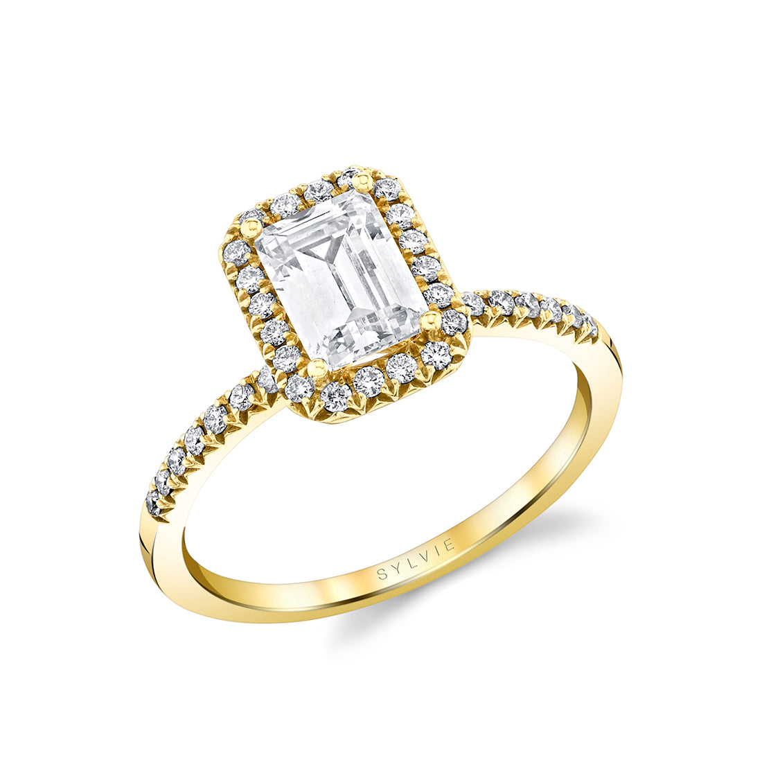 This gorgeous Sylvie Designed emerald cut halo engagement ring includes a 1 carat semi mount for an emerald-shaped diamond with a single halo of sparkling diamonds. The band features a train down both sides of shimmering, round-cut diamonds, making the total weight of this stunning setting come to 0.22CTW. Pair it with Sylvie Designed matching wedding band for a stylish look!