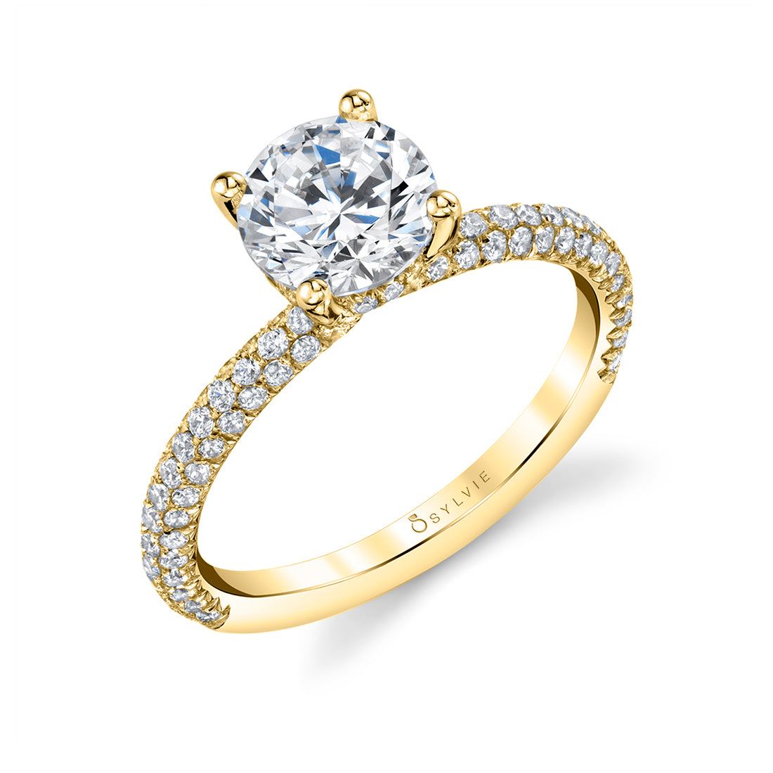 This Sylvie Designed Jayla Round Cut Classic Pave Engagement Ring. This stunning classic pave engagement ring features a fitting for a 3.00CTW round brilliant center diamond in a prong setting, atop a shank of 0.47CTW shimmering pave diamonds going ½ way around the ring. It can be customized with any center stone and your preferred metal and would match the Sylvie Designed Yasmine wedding band.