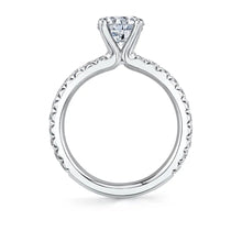 A Sylvie Designed Vanessa Round Cut Classic Engagement Ring. This stunning classic engagement ring features a 1 ¼ round brilliant center diamond. The setting showcases 0.52CTW of sparkling diamonds also cascading ¾ of the way down both sides of the band in a smooth fishtail style pave setting. This ring is also available with an eternity band and could be customized with any shape center stone.