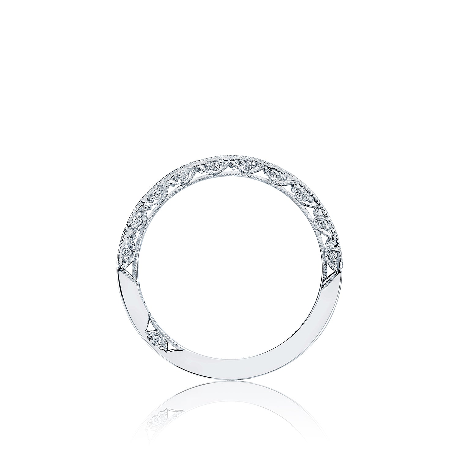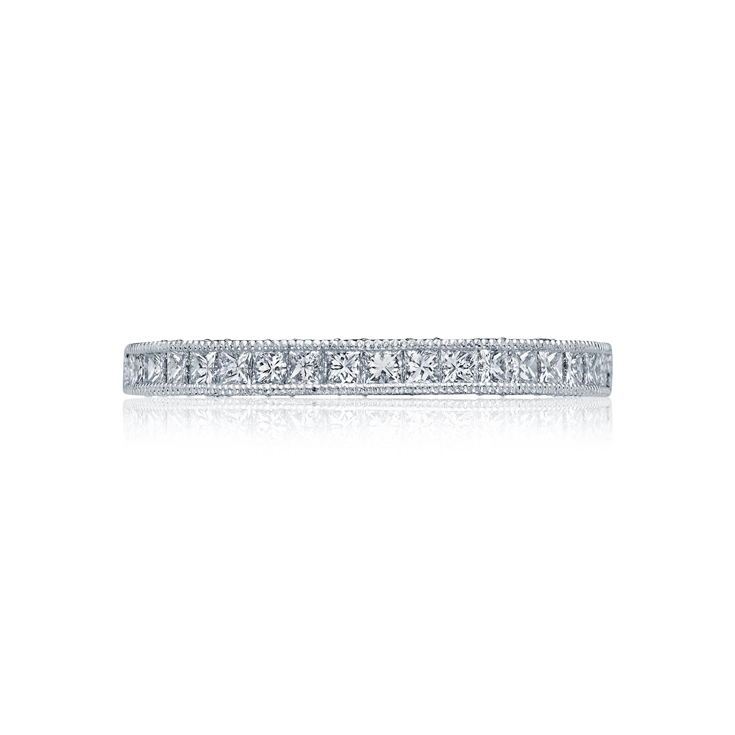 Diamond crescents illuminate a string of channel set princess cut diamonds for a modernly streamlined look that will complement many Tacori engagement rings.