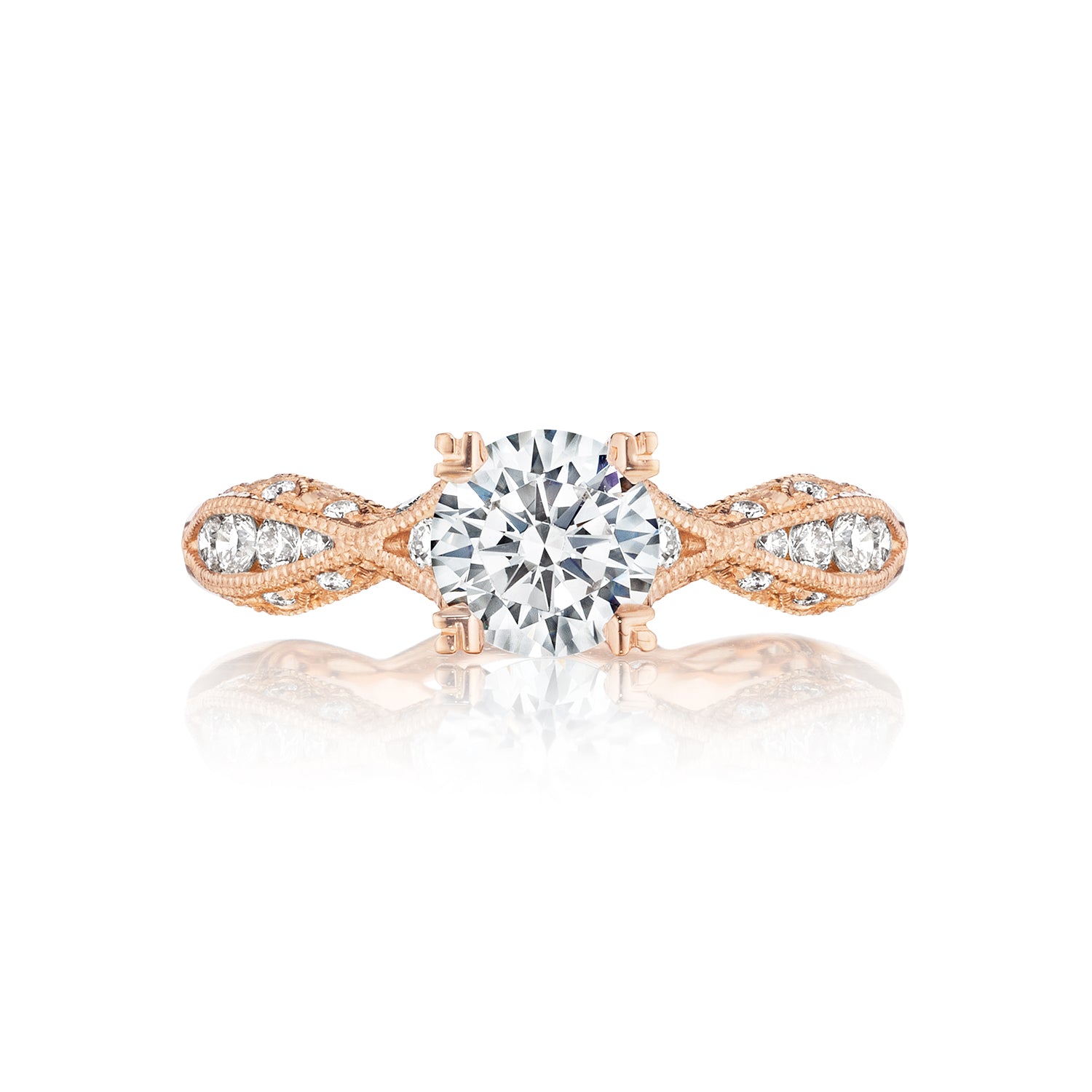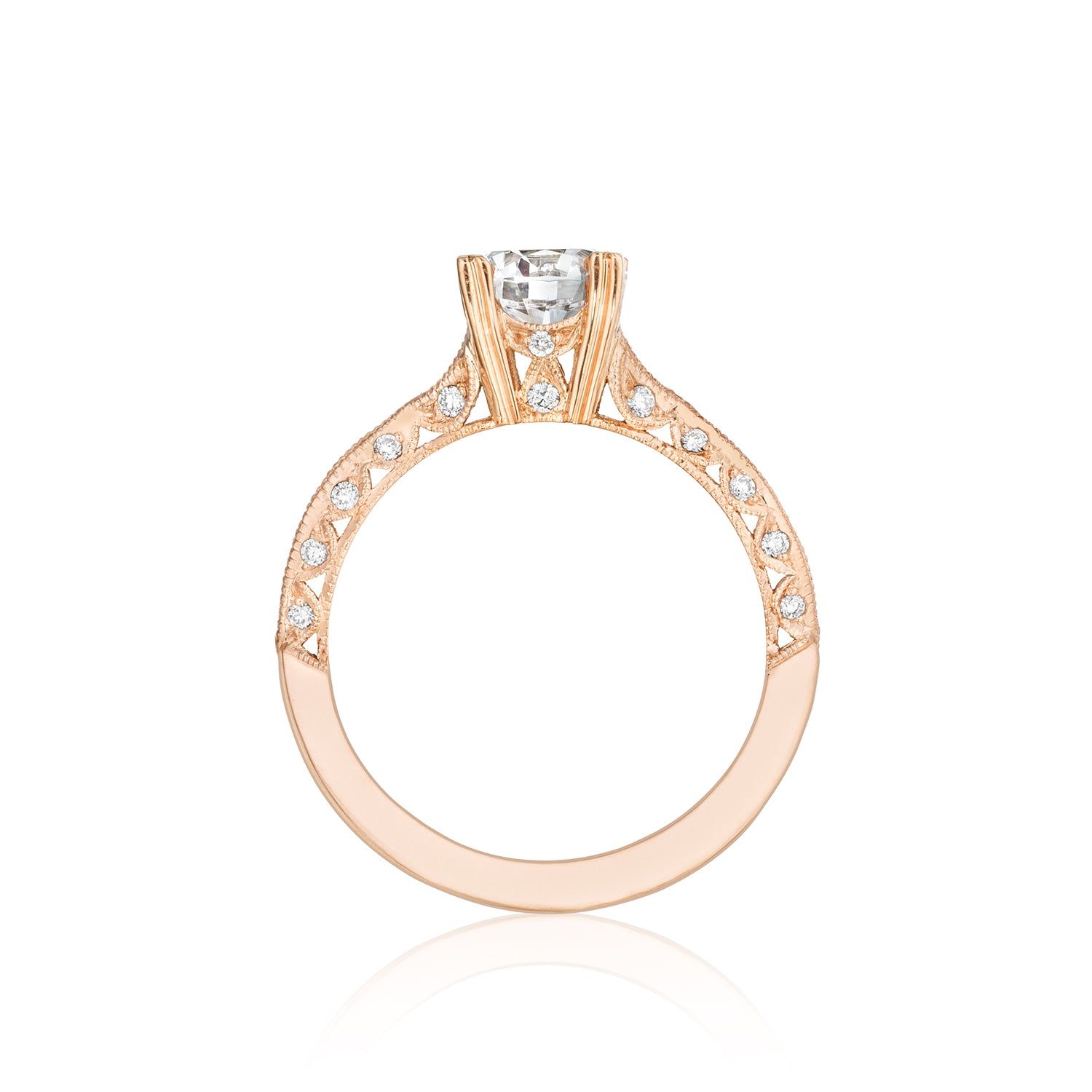 Round-brilliant diamonds are channel set into the ceiling of the band. Intricate criss-crossed milgrain draws the eye to the center stone, which is elevated by the Cathedral Foundation.