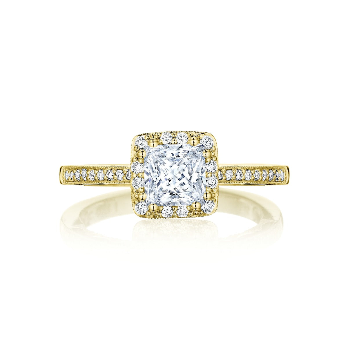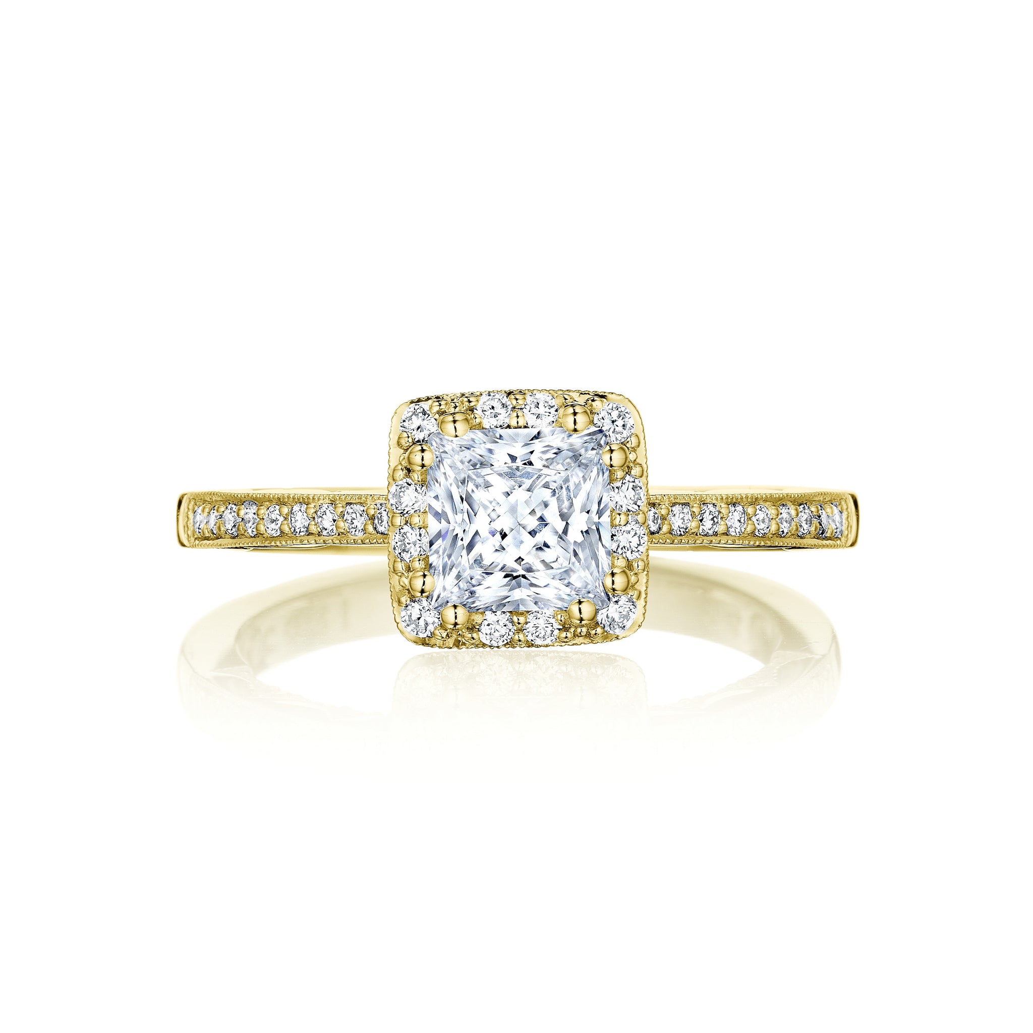 A princess cut diamond solitaire is brought to life by a crown of diamonds and rests gently on an eternity diamond band. This ring features a brand new crescent inner face with pinpoint diamond details for a truly regal look.