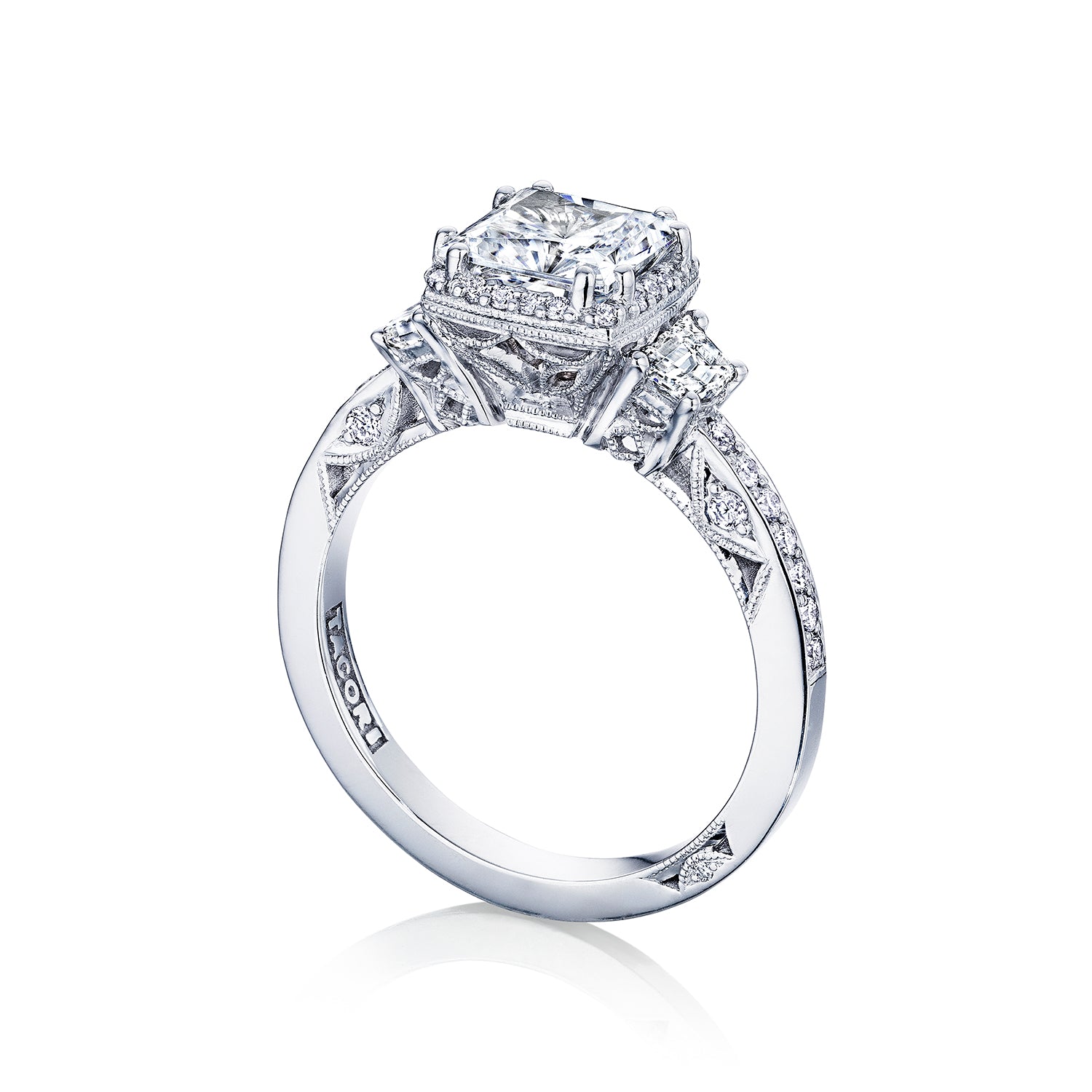 To celebrate the 10th Anniversary of our classic Dantela style, our designers are reintroducing it with a contemporary flair. With three times the charm, your princess center is enhanced by a diamond bloom and brought to life by two high-intensity cadillac side stones. Polished off with a pavé set diamond band, this ring is simply irresistible.