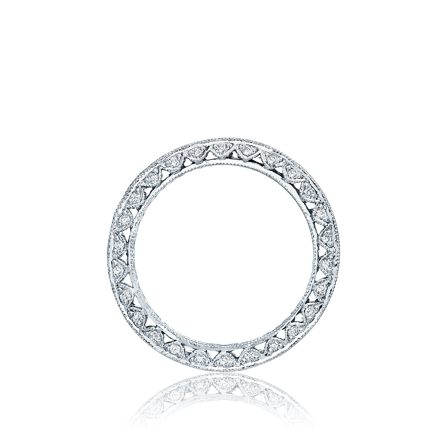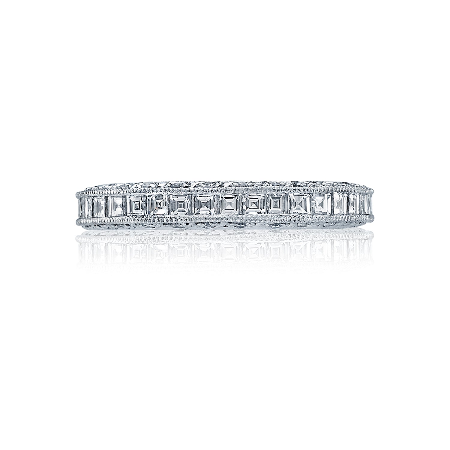 This 3.5mm Tacori Crescent Collection wedding band features princess channel-set diamonds all the way around the band and round pave-set diamonds accenting the crescent silhouette details.
