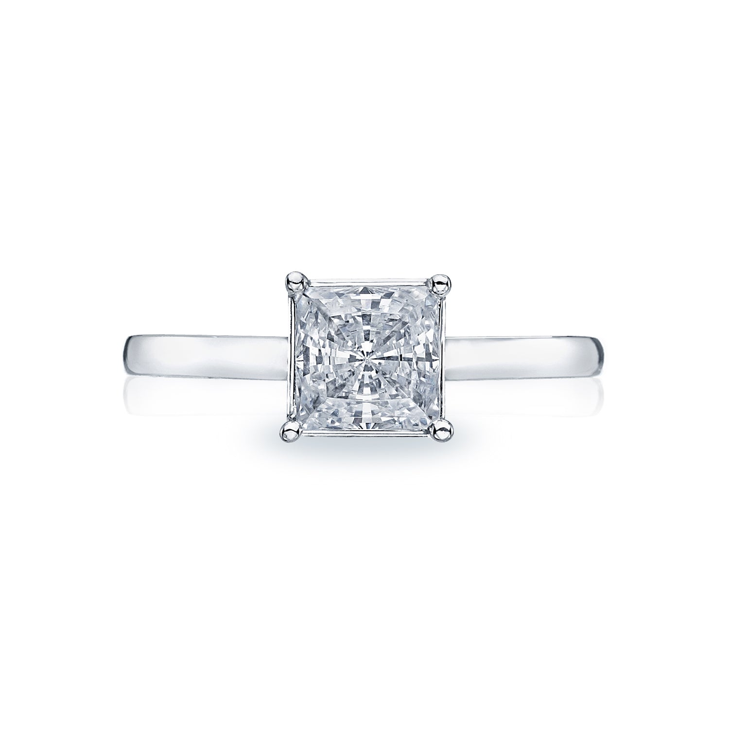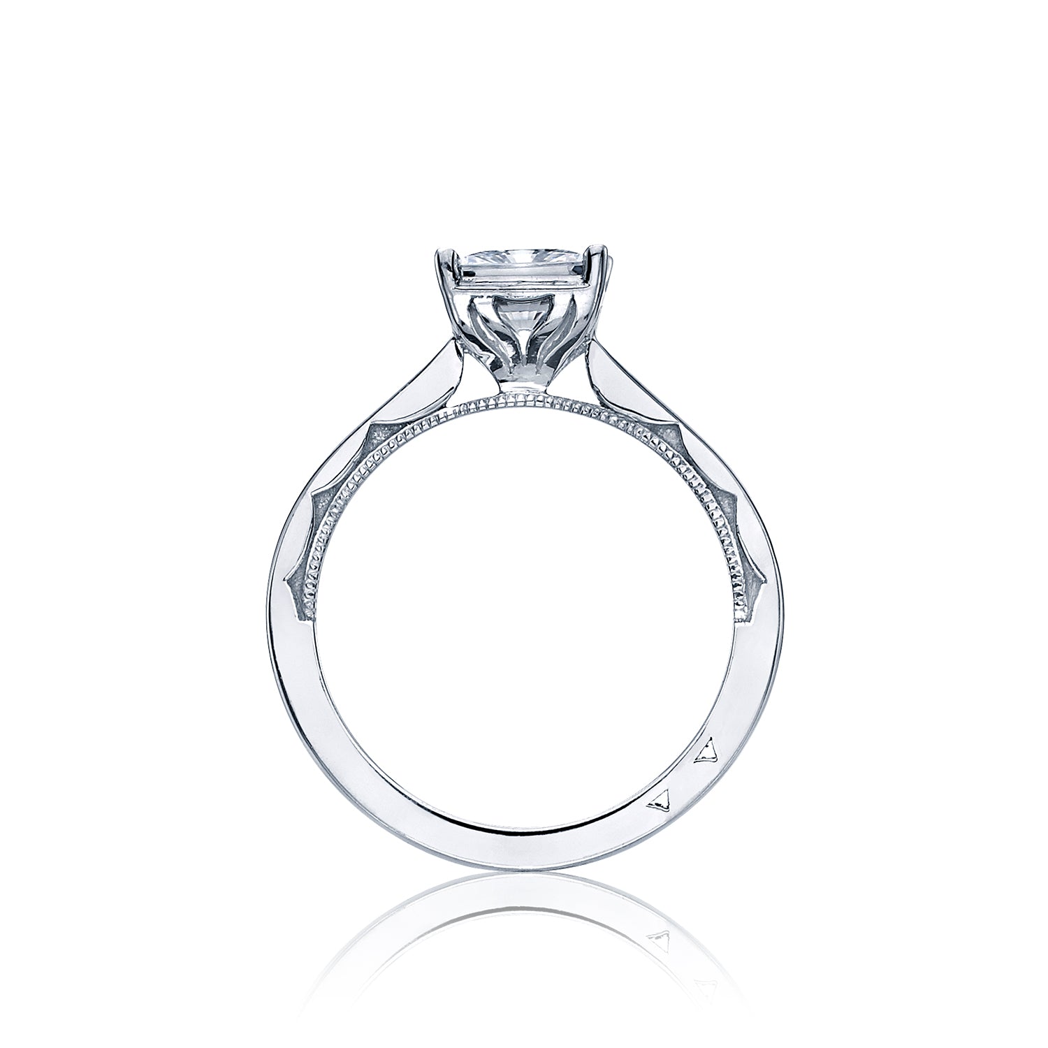 A tapered, split foundation creates a beautiful look on a petite platinum solitaire for a princess cut diamond. With crescent designs decorating the foundation, and slender tendrils creating a look of botanical beauty, this pretty treasure possesses a timeless elegance.