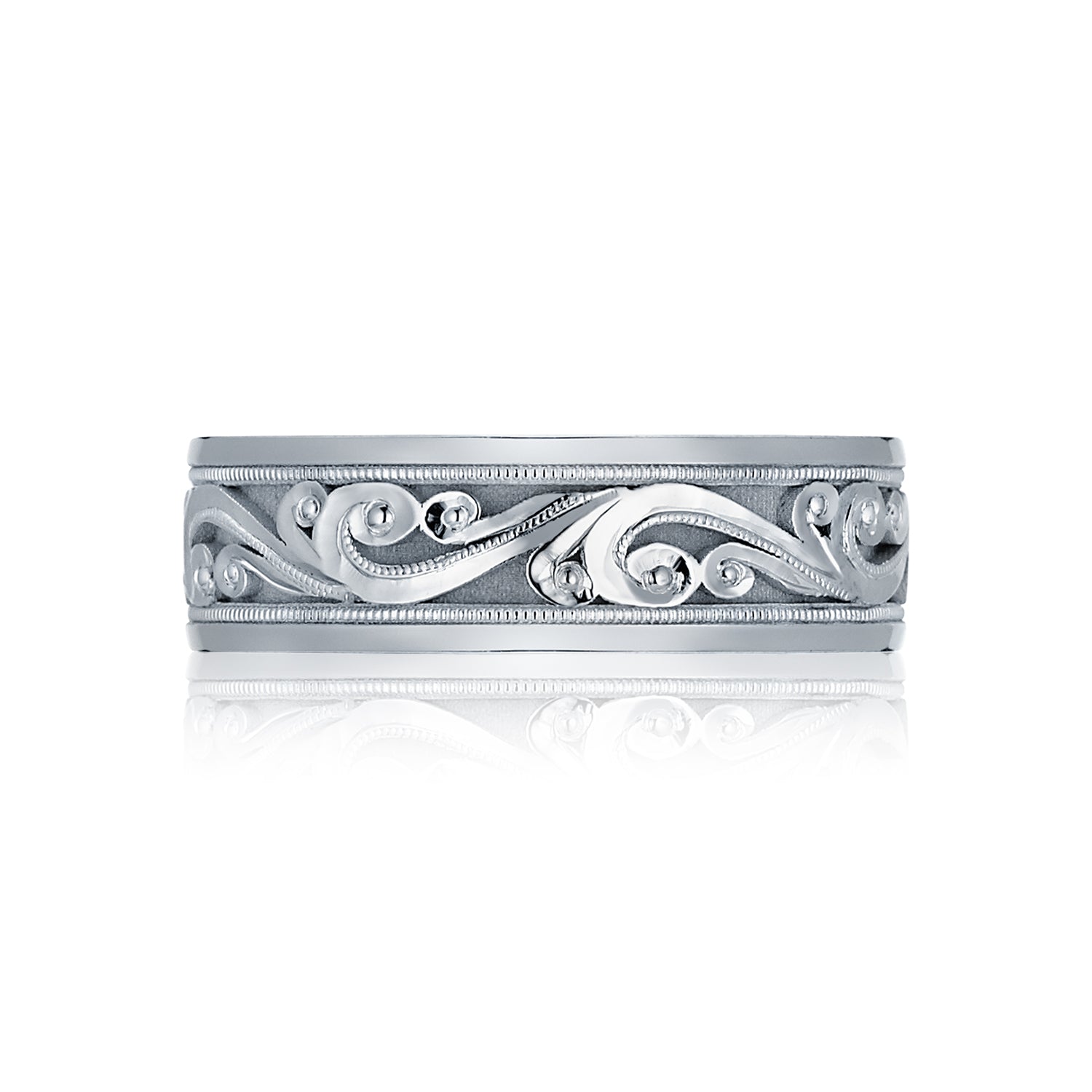 Unique hand engraved signature Tacori details decorating this 7mm crescent engraved band, you will not be able to take your eyes off this stunning design!