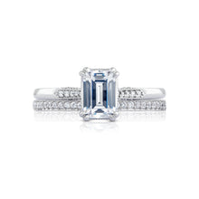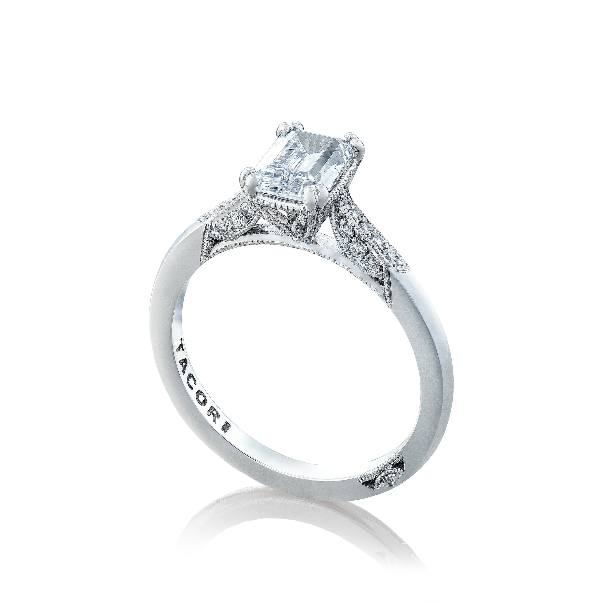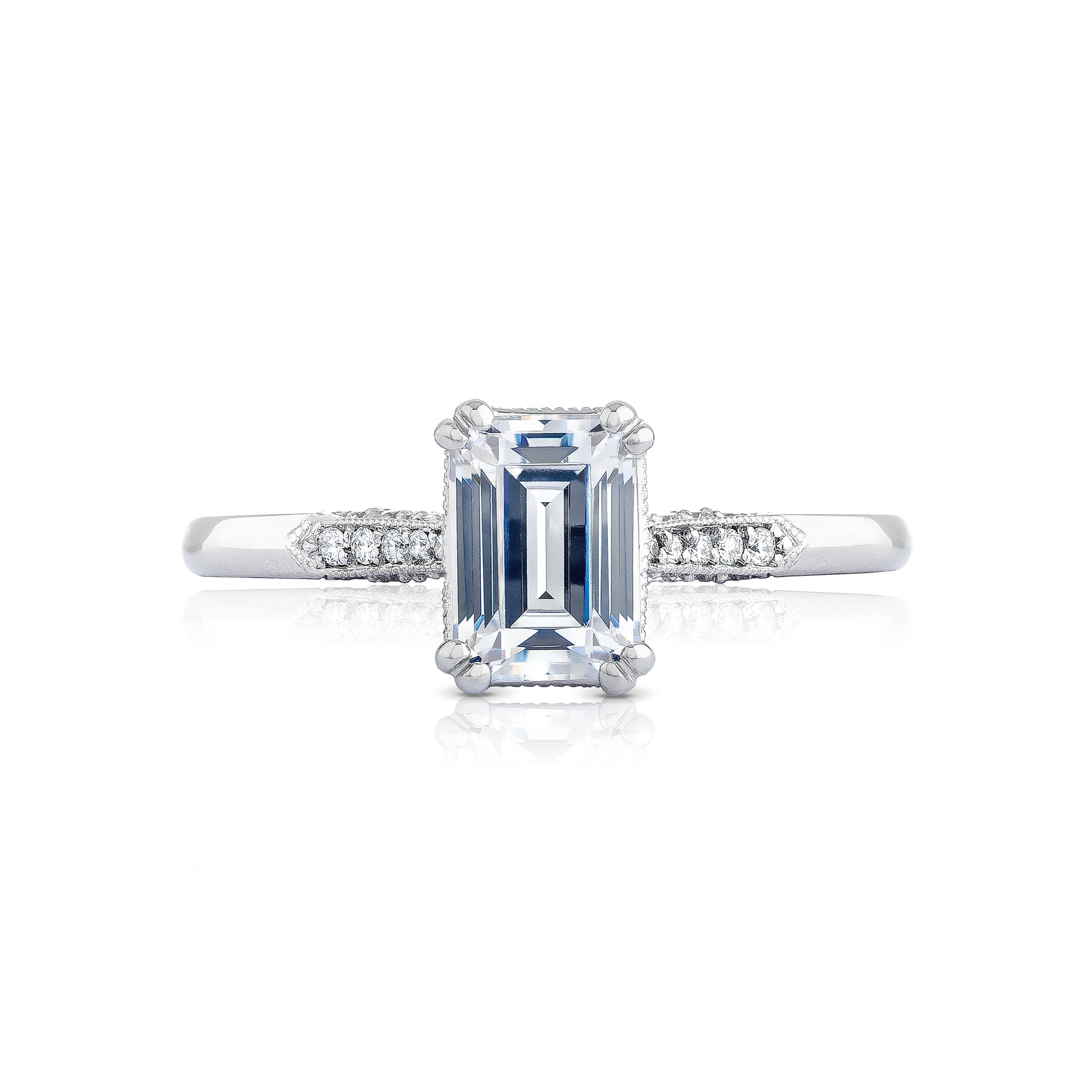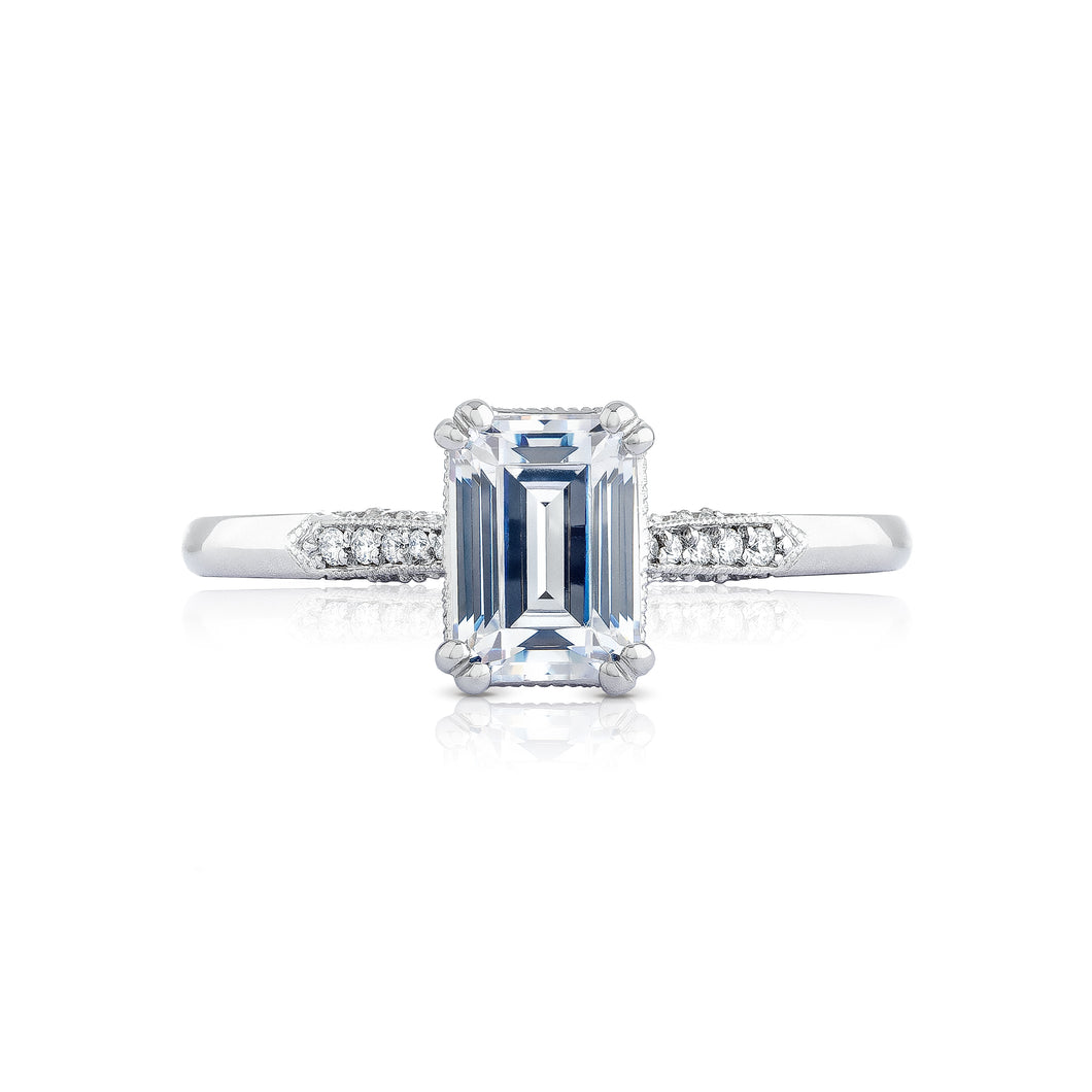 Classic and exquisite, this stunning engagement ring with an emerald center is for the Tacori Girl who enjoys the simple things in life. Brilliant Pavé diamonds dance along the ceiling of the high polished band with hidden diamond details along the inner face.